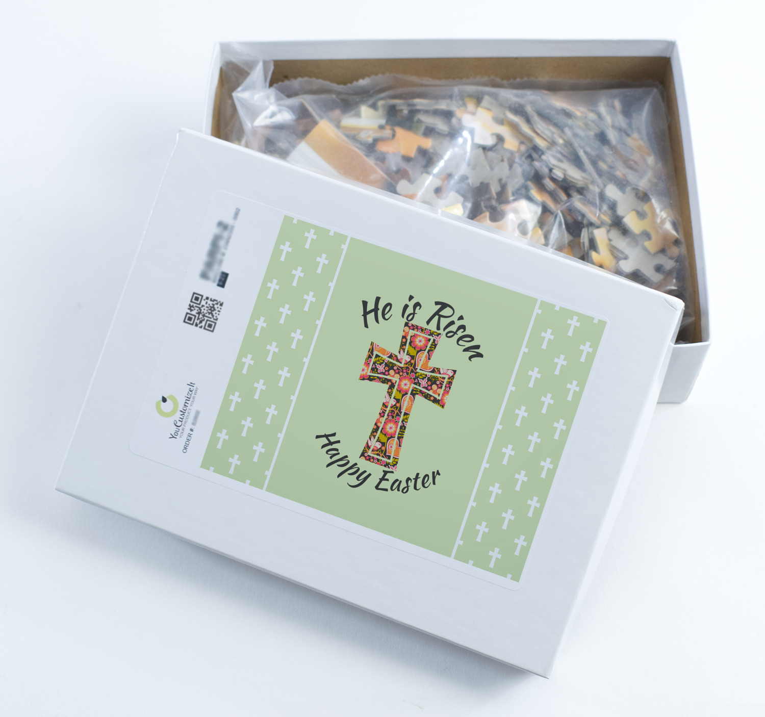 We print our puzzles on thick white chipboard in vibrant colors, then laminate the chipboard and die cut your puzzle. Your jigsaw puzzle is shipped to you in a box with the image of the puzzle on the box.