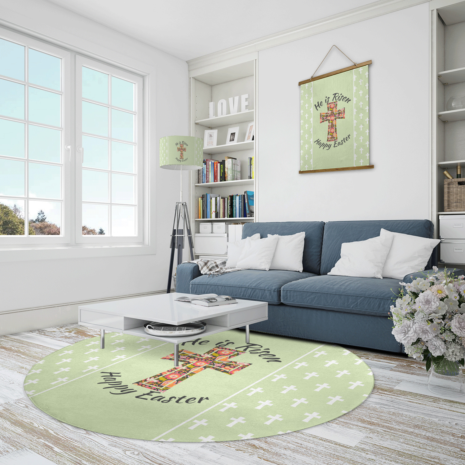 Our custom round area rugs and rectangular area rugs are both velvety soft and smooth, with a short pile, beautiful sewn corners and edges on the poly chenille face. We recommend adding an anti-slip mat under your round area rug to prevent it from sliding when under foot when placed on hard or smooth surfaces.