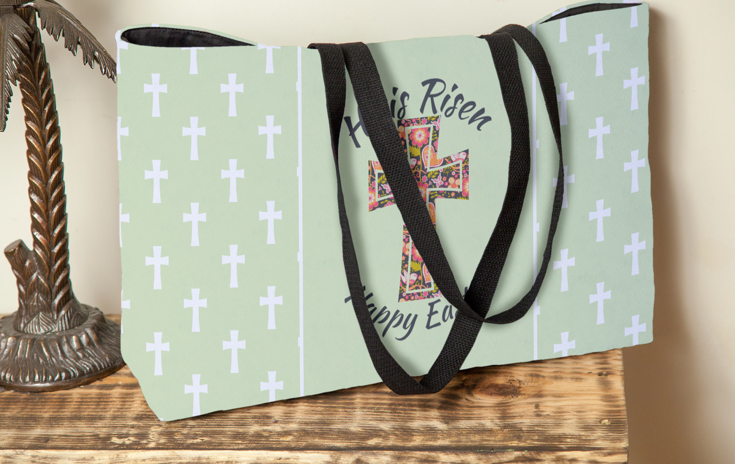 This Easter design celebrates the resurrection of Jesus Christ. For our background, we chose to use the vertically split background where the sides are a simple tone on tone pattern of crosses. The middle is a solid color. We chose a light green to represent spring. We chose our arched text and graphic style for the foreground. For the graphic, we chose a simple cross that is filled with floral pattern of birds and hearts. For our text we used "He is Risen" on top and "Happy Easter" on the bottom.
