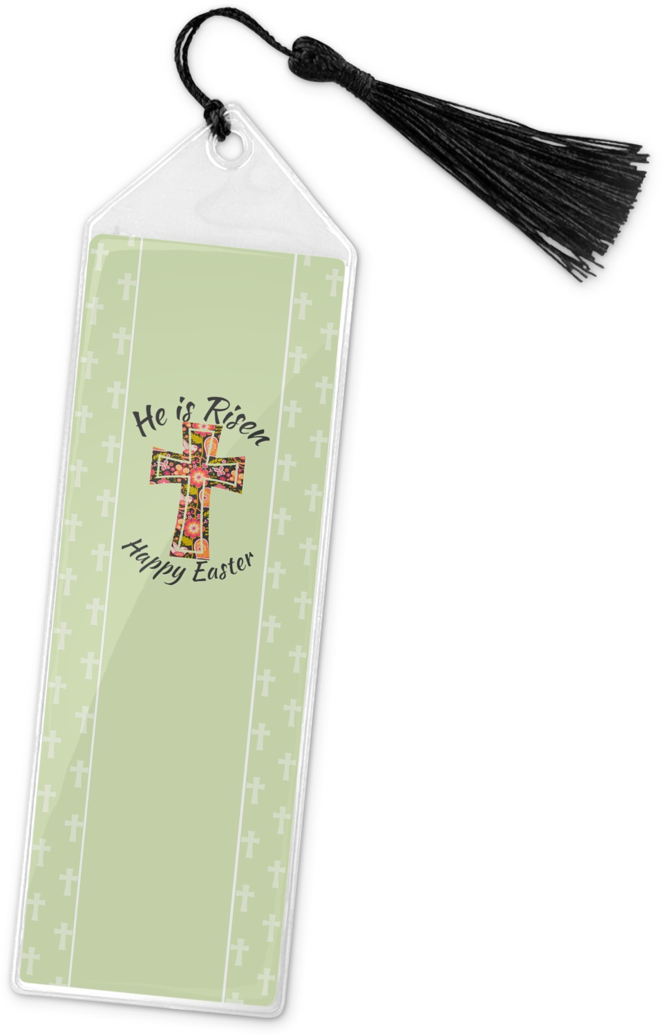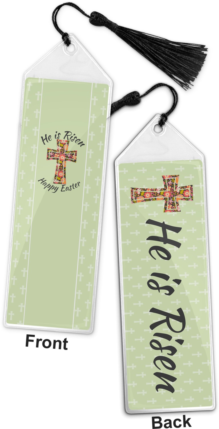 Your personalized bookmark is made of a sturdy, clear vinyl, and is approximately 7.5" x 2.25". We display your personalization on vinyl inserts that are placed on both sides. Accompanying each book marker is a black, fringe tassel that attaches to the reinforced, triangular header.