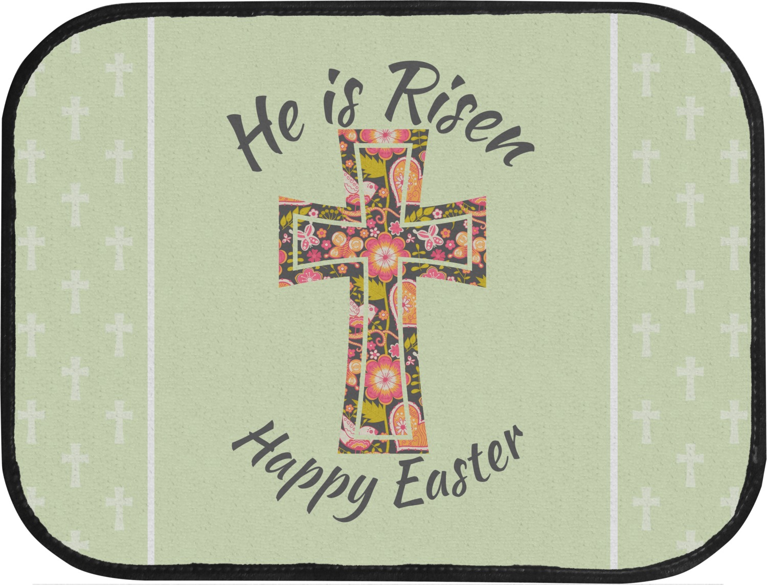 This Easter design celebrates the resurrection of Jesus Christ. For our background, we chose to use the vertically split background where the sides are a simple tone on tone pattern of crosses. The middle is a solid color. We chose a light green to represent spring. We chose our arched text and graphic style for the foreground. For the graphic, we chose a simple cross that is filled with floral pattern of birds and hearts. For our text we used "He is Risen" on top and "Happy Easter" on the bottom.