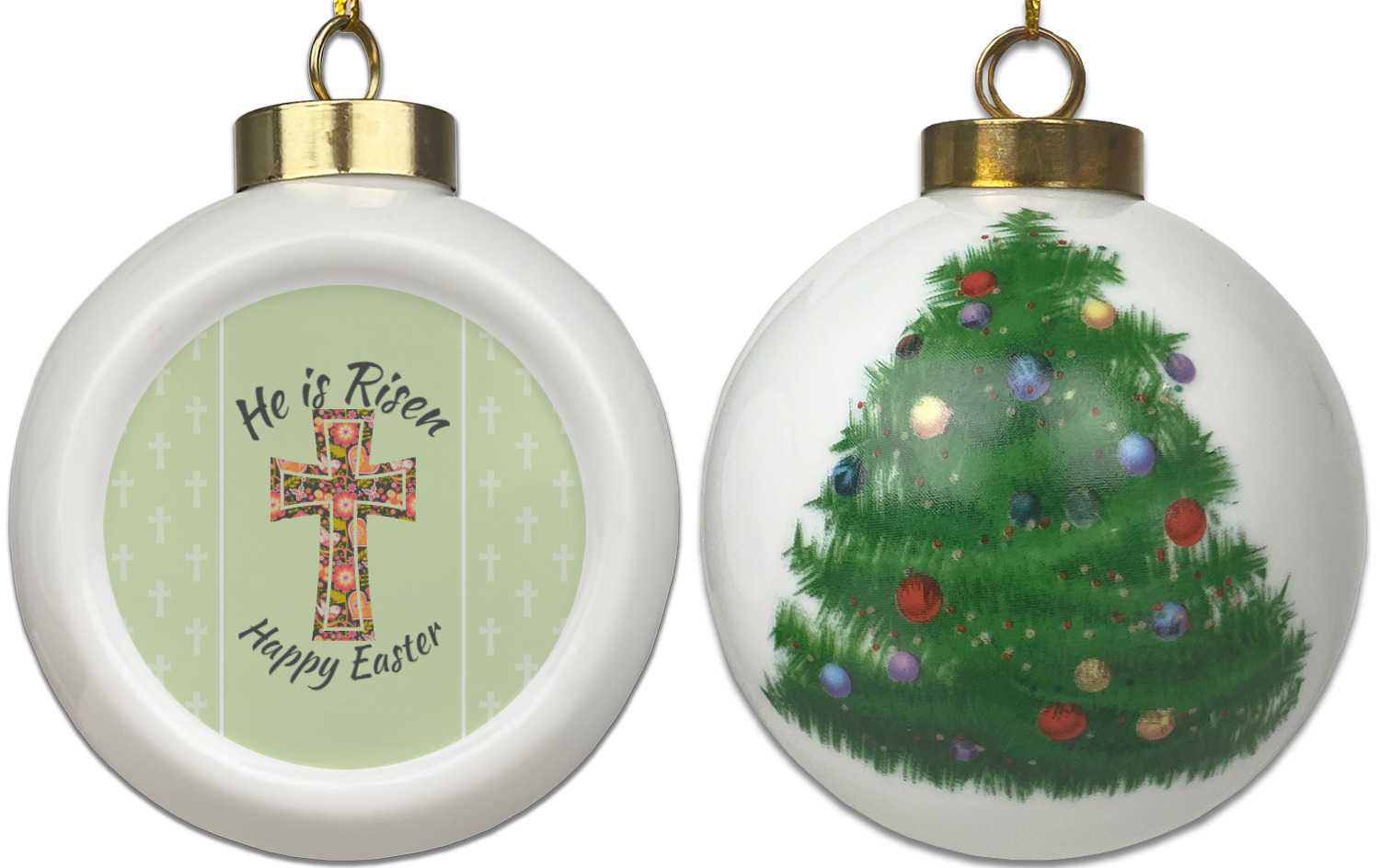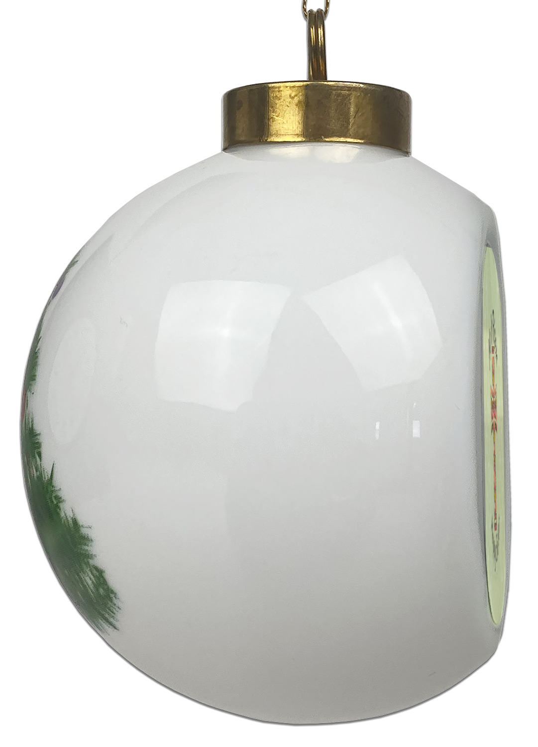 Our Christmas ornaments are a unique ceramic ball shape with a twist as it has a flat face to display your custom design! Select from one of our two design types - Christmas Tree or Poinsettia Garland - to adorn the curved back of your personal design. Each ornament measures 3H x 2.5W x 2D accompanied with a gold string accent for finishing touches to hang on your beautiful Christmas tree!