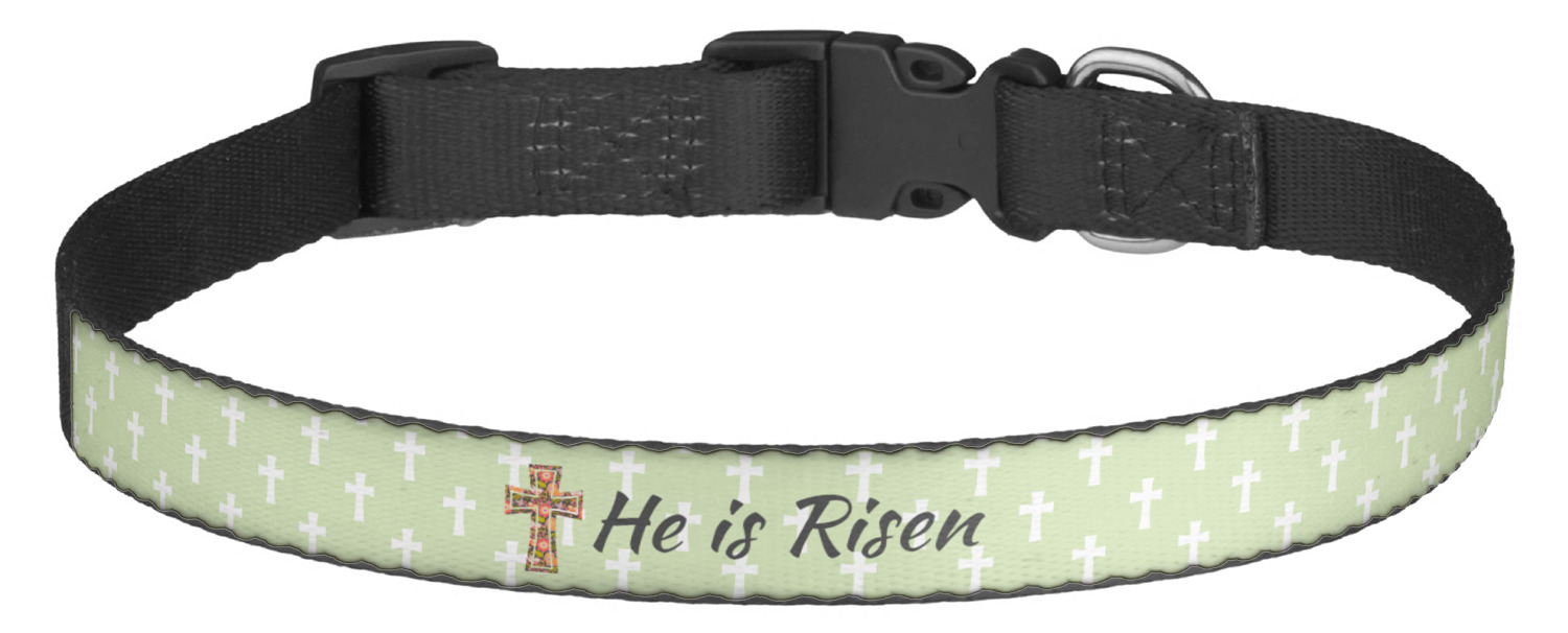 This sturdy collar, made from a durable nylon weave, will outlive your dog's episodes of excited tugging and pulling. Courtesy of its thick plastic buckle and adjuster, this collar is adjustable and accommodating of any dog. Structurally, the collar is a single piece of nylon weave that is sewn together, and features a solid metal loop where you can attach a leash or dog tag. We print and display your dog's name and pattern across the middle of the personalized dog collar.