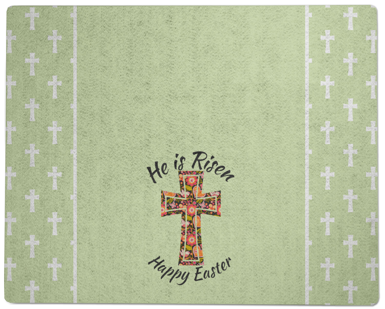 This Easter design celebrates the resurrection of Jesus Christ. For our background, we chose to use the vertically split background where the sides are a simple tone on tone pattern of crosses. The middle is a solid color. We chose a light green to represent spring. We chose our arched text and graphic style for the foreground. For the graphic, we chose a simple cross that is filled with floral pattern of birds and hearts. For our text we used "He is Risen" on top and "Happy Easter" on the bottom.