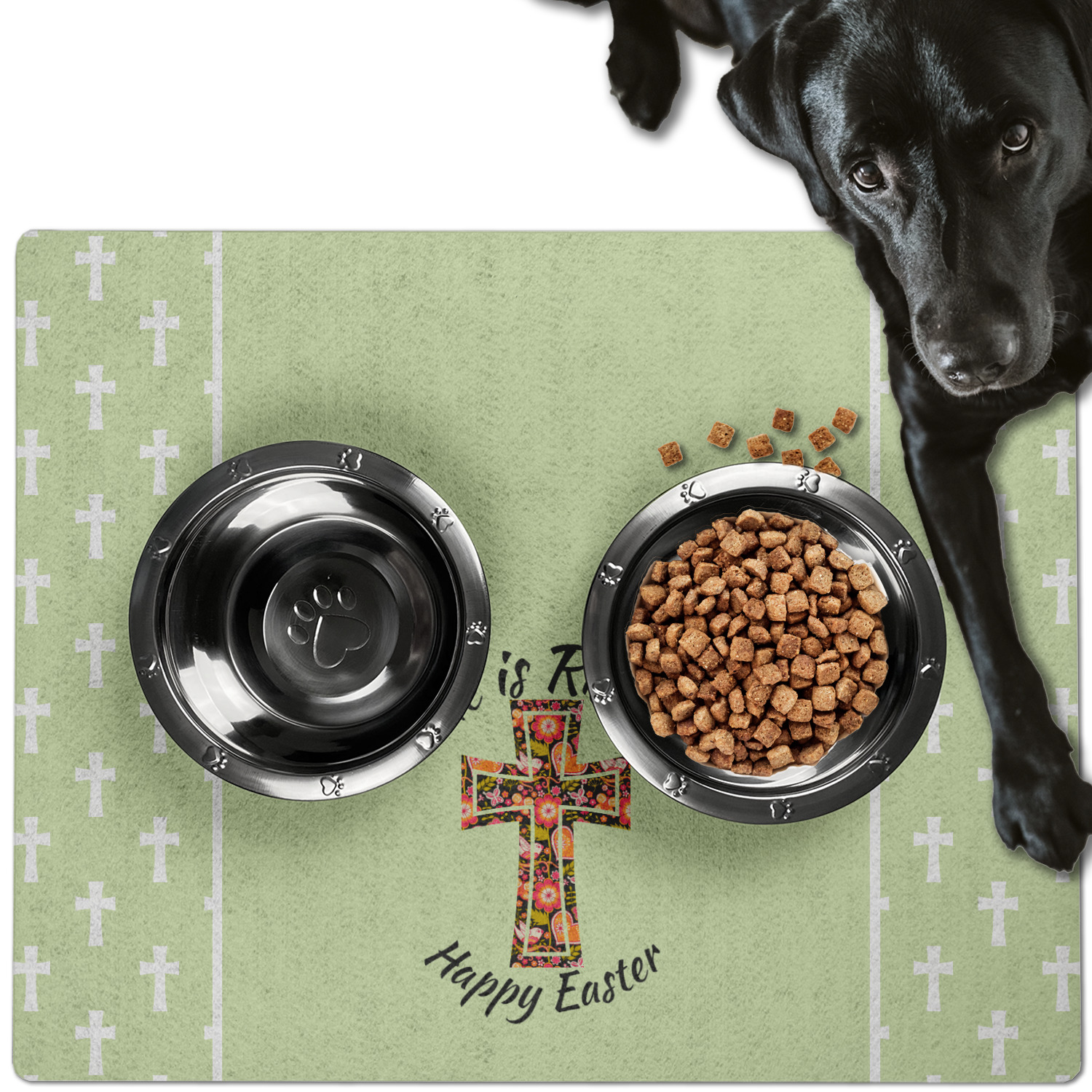 This dog bowl mat, fabricated from polyester, proudly displays your customized design on its top, while its bottom includes a non-slip rubber. This feature allows it to remain firmly in place, even when your dog spills his/her water. With 3 sizes available (18" x 12", 24" x 18", 30" x 24"), the pet food mat has ample space for both a food and water bowl for any sized dogs. Though specified for dogs' use, these mats are also a splendid option for cats.