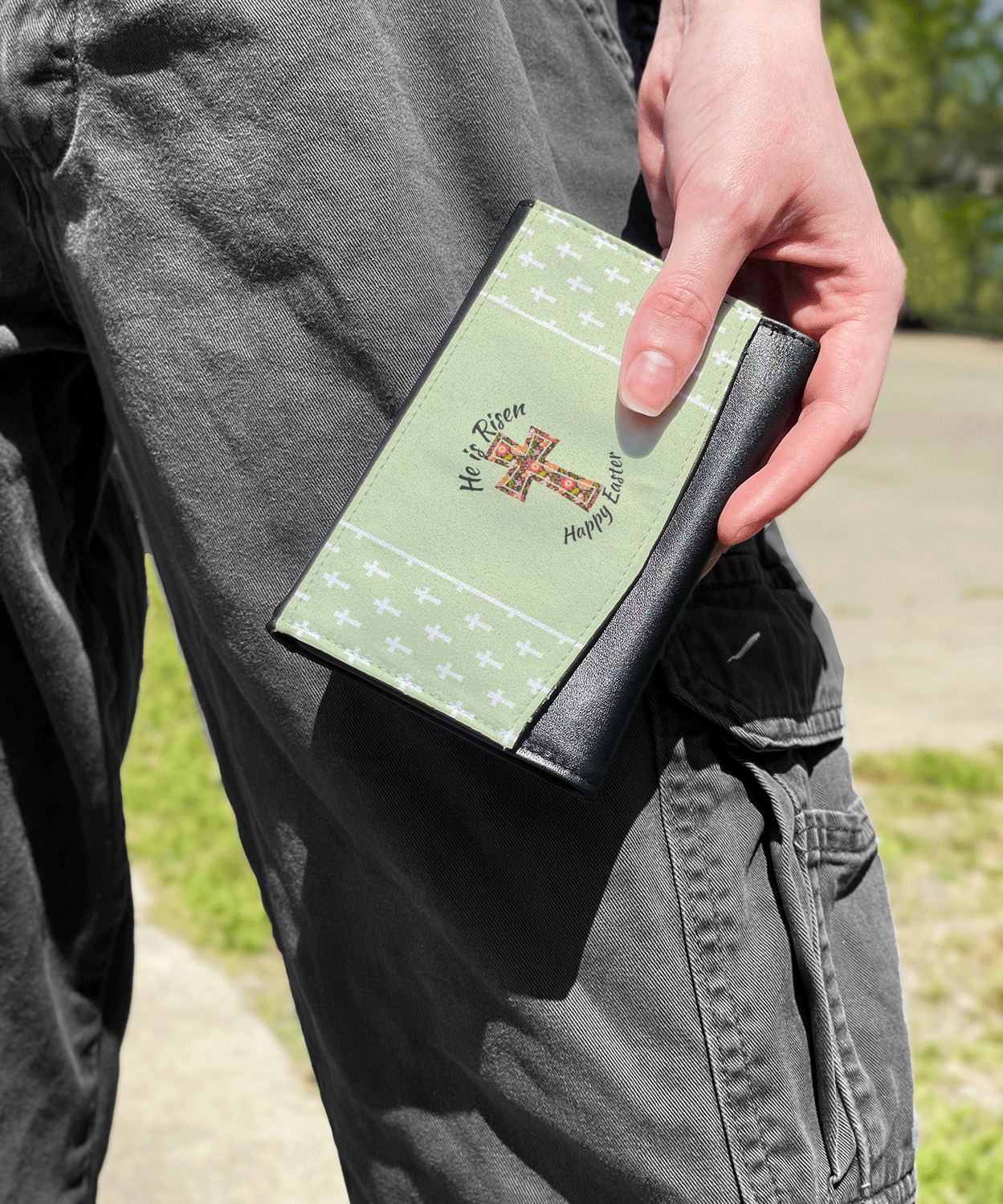This Easter design celebrates the resurrection of Jesus Christ. For our background, we chose to use the vertically split background where the sides are a simple tone on tone pattern of crosses. The middle is a solid color. We chose a light green to represent spring. We chose our arched text and graphic style for the foreground. For the graphic, we chose a simple cross that is filled with floral pattern of birds and hearts. For our text we used "He is Risen" on top and "Happy Easter" on the bottom.