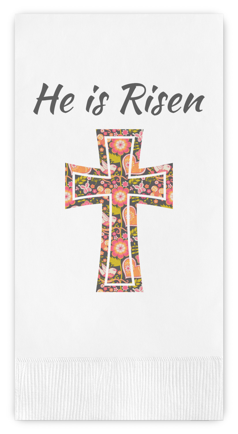 This Easter design celebrates the resurrection of Jesus Christ. For our background, we chose to use the vertically split background where the sides are a simple tone on tone pattern of crosses. The middle is a solid color. We chose a light green to represent spring. We chose our arched text and graphic style for the foreground. For the graphic, we chose a simple cross that is filled with floral pattern of birds and hearts. For our text we used "He is Risen" on top and "Happy Easter" on the bottom.