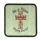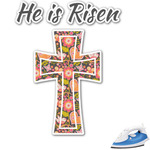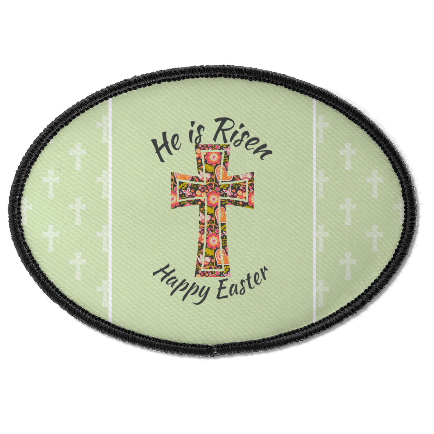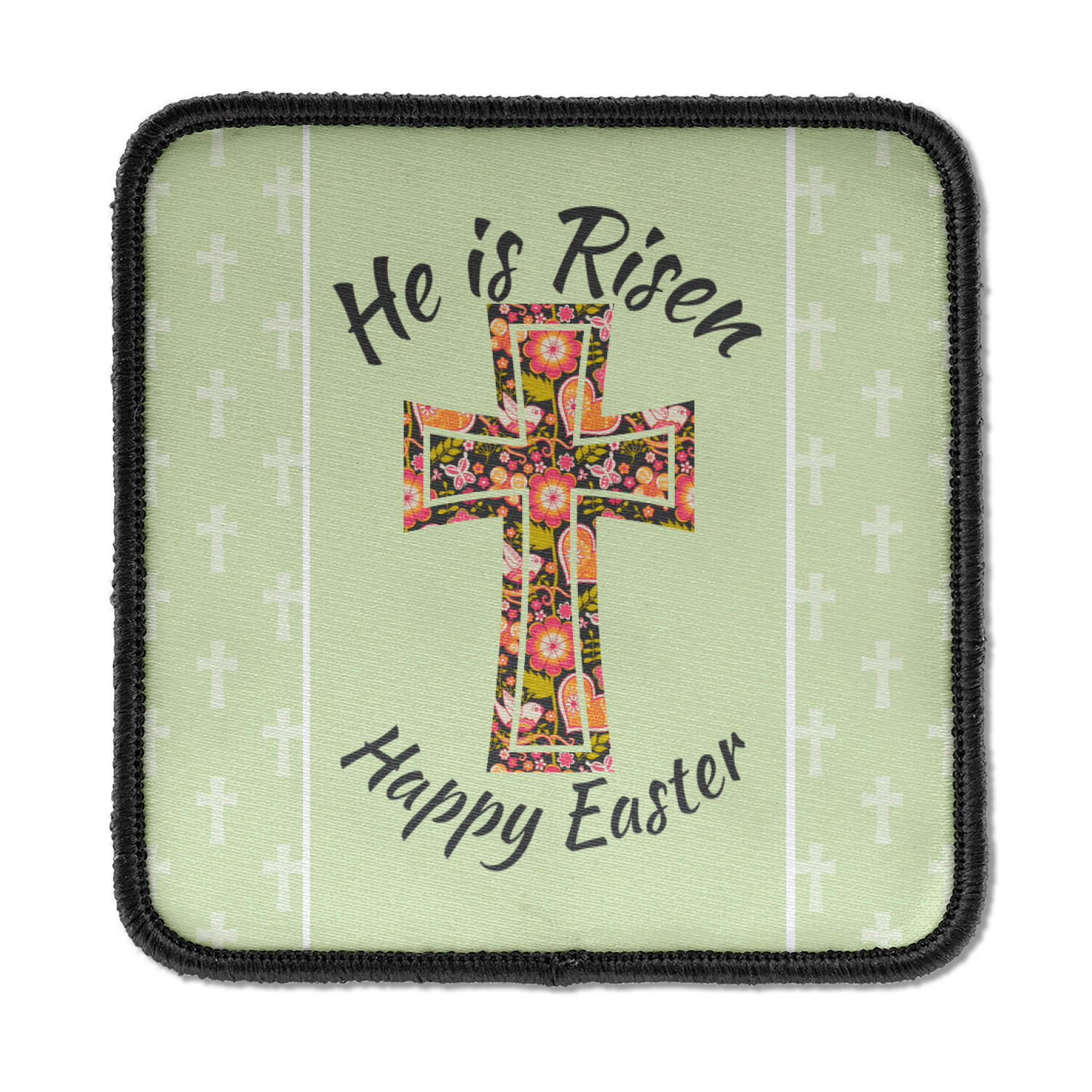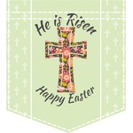 This Easter design celebrates the resurrection of Jesus Christ. For our background, we chose to use the vertically split background where the sides are a simple tone on tone pattern of crosses. The middle is a solid color. We chose a light green to represent spring. We chose our arched text and graphic style for the foreground. For the graphic, we chose a simple cross that is filled with floral pattern of birds and hearts. For our text we used "He is Risen" on top and "Happy Easter" on the bottom.
