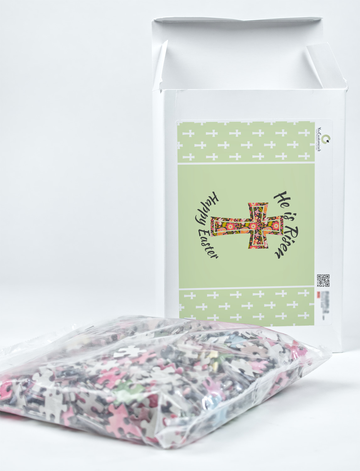 You can also upload your logo or art that you or your kids drew. To create more challenging jigsaw puzzles, you can create a pattern from with your logo or artwork. You can also add other elements such as text or personalization.