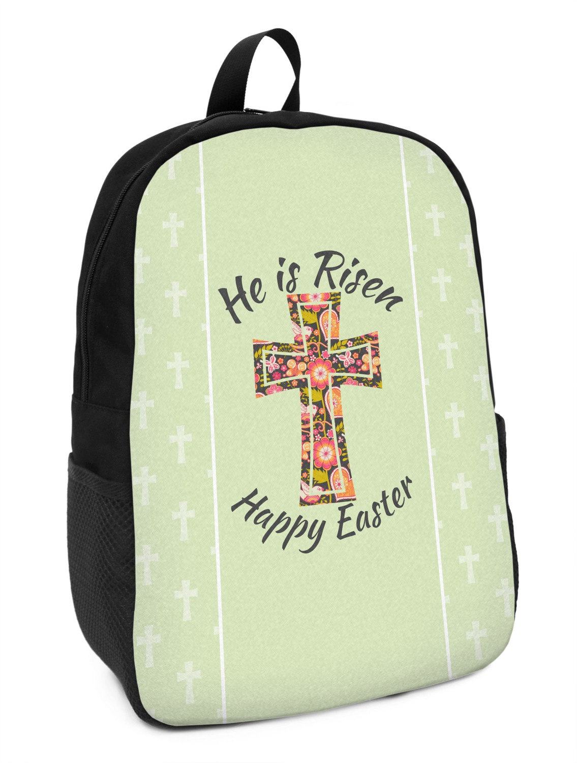 These small backpacks are made of a durable black canvas material with your personalization right on the front. The two shoulder straps are padded and easily adjustable. The bag itself measures at about 11" W x 15" H x 5" D. It's the perfect size for elementary aged kids or adults who want a smaller backpack. On the top of the bag you will find a handle to hang or carry your backpack by as well as a large zipper closure to keep all of your belongings safe inside. On each side of your backpack is a mesh pocket for a small item or water bottle. Inside your backpack you will find a spacious area with a small zipper pocket and a padded laptop slot that will fit up to a 13" laptop (13" being very snug). This is the perfect bag for any student that needs a couple books and their laptop with them at all times. It also works great as a carry on for traveling!