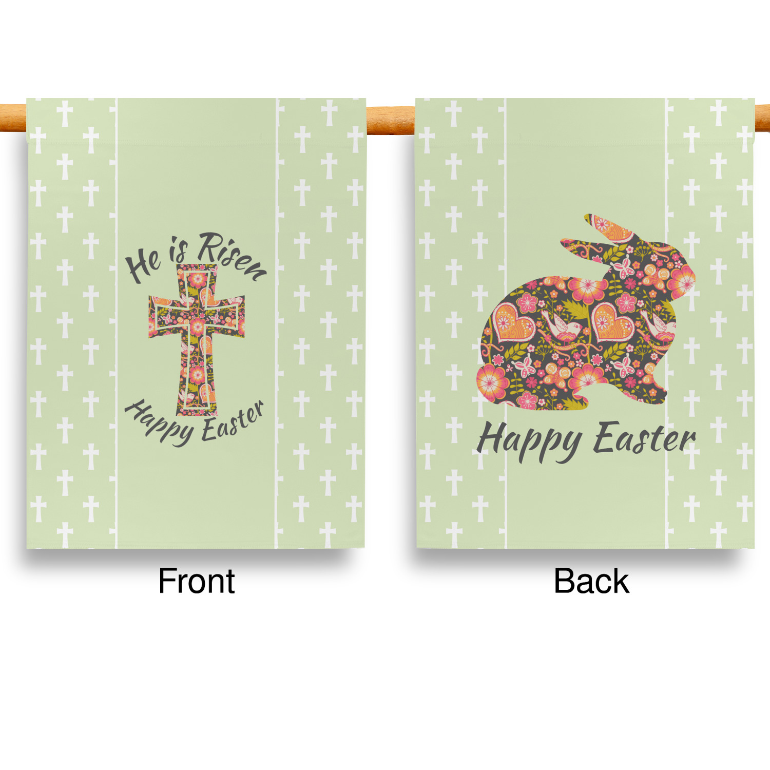 These custom garden flags are made of a durable, double-ply, polyester weave, allowing them to withstand the elements year round. The small flags measure at approximately 12 by 18 inches. The large flags measure out to 28 by 37 inches. You can order these decorative flags with your customization printed on the front only, or the front and back.