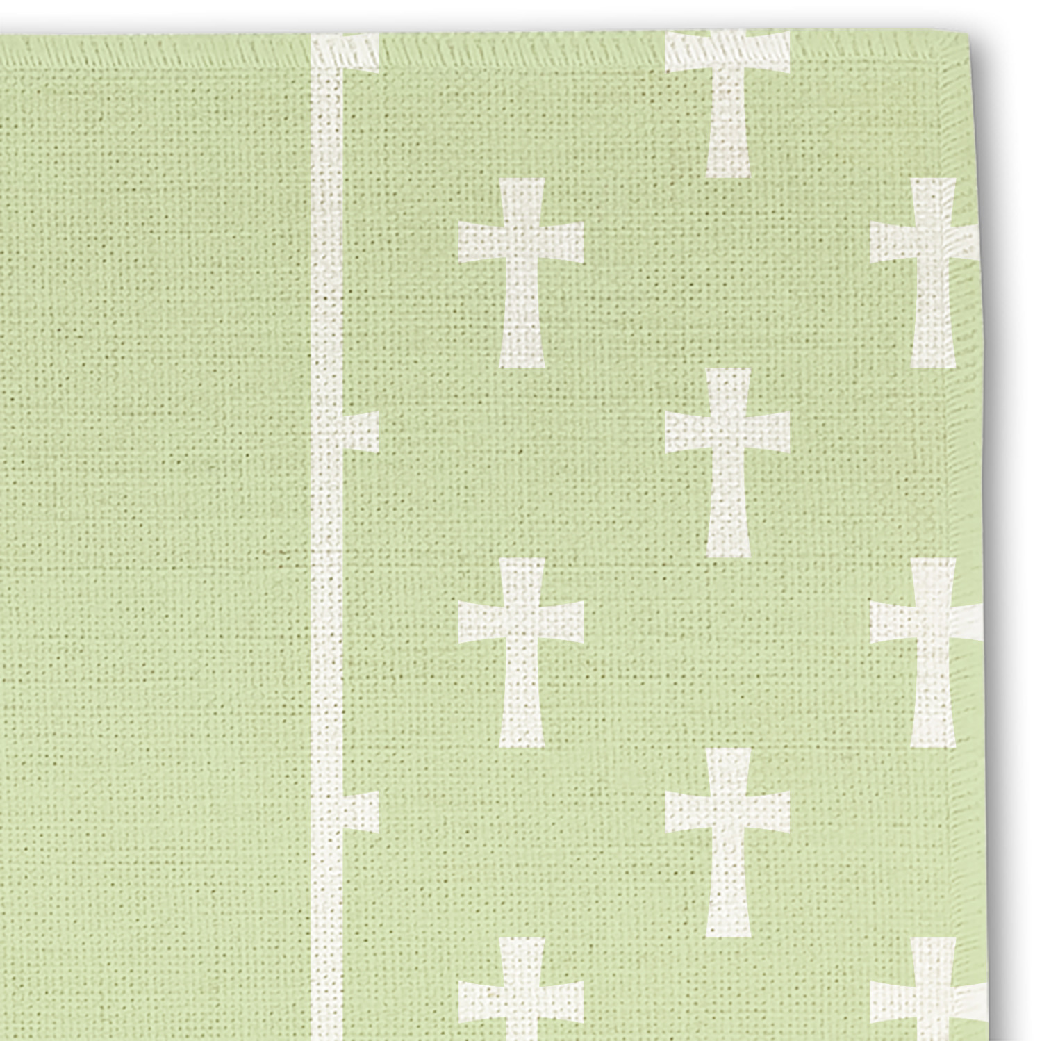 This Easter design celebrates the resurrection of Jesus Christ. For our background, we chose to use the vertically split background where the sides are a simple tone on tone pattern of crosses. The middle is a solid color. We chose a light green to represent spring. We chose our arched text and graphic style for the foreground. For the graphic, we chose a simple cross that is filled with floral pattern of birds and hearts. For our text we used "He is Risen" on top and "Happy Easter" on the bottom.