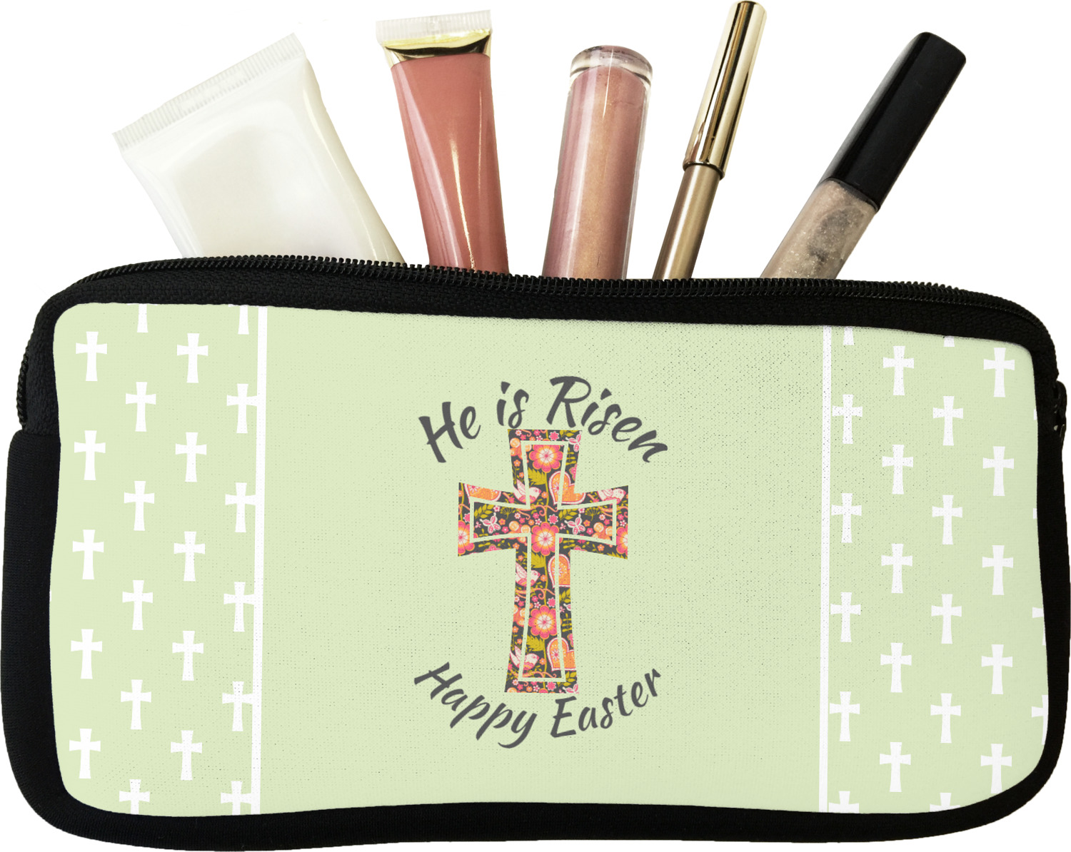 Our personalized makeup bags are available in many different designs, patterns and colors - so you are sure to find one that will love. They are made of neoprene (same material as wet-suits) and thus are water resistant, so spillages in your makeup bag will not end up all over you purse. They are customized on one side and are black on the other side and the zipper is black as well.