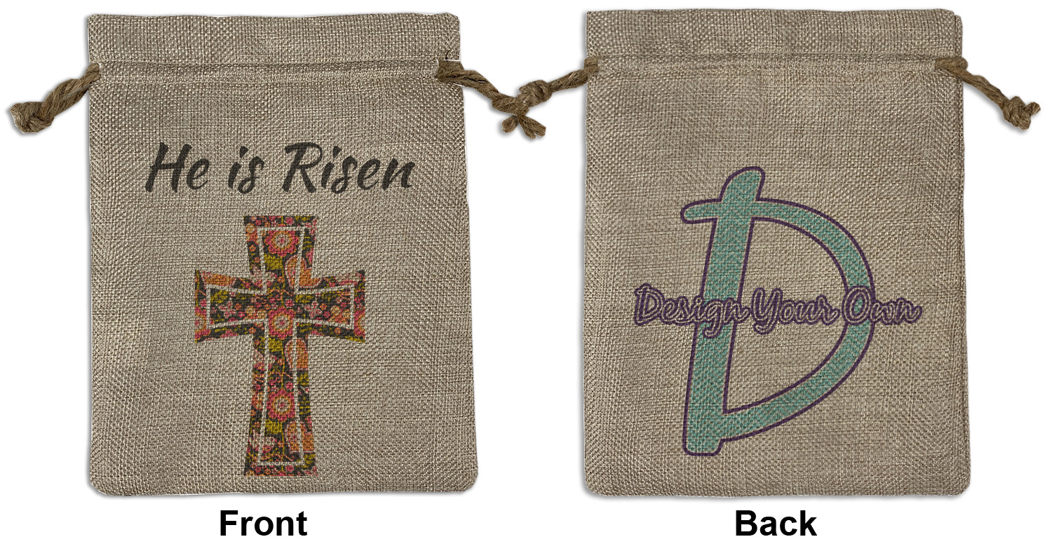 We sell our Burlap Gift Bags in 3 variant sized bags. Made with burlap polyester, each personalized bag can be secured with a twine drawstring pull. Your custom design is available to print on one side or both sides - completely up to you! The sizes of the bags measure approximately 4.5" x 6.5" for the smallest size, 6.5" x 8.0" for the medium size, and 6.5" x 13.5" for the large-sized bag.