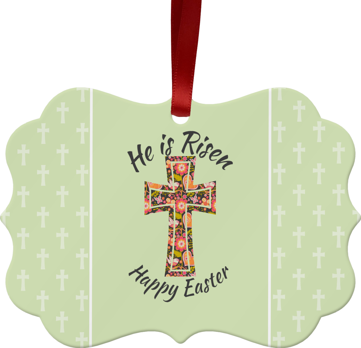 This Easter design celebrates the resurrection of Jesus Christ. For our background, we chose to use the vertically split background where the sides are a simple tone on tone pattern of crosses. The middle is a solid color. We chose a light green to represent spring. We chose our arched text and graphic style for the foreground. For the graphic, we chose a simple cross that is filled with floral pattern of birds and hearts. For our text we used "He is Risen" on top and "Happy Easter" on the bottom.
