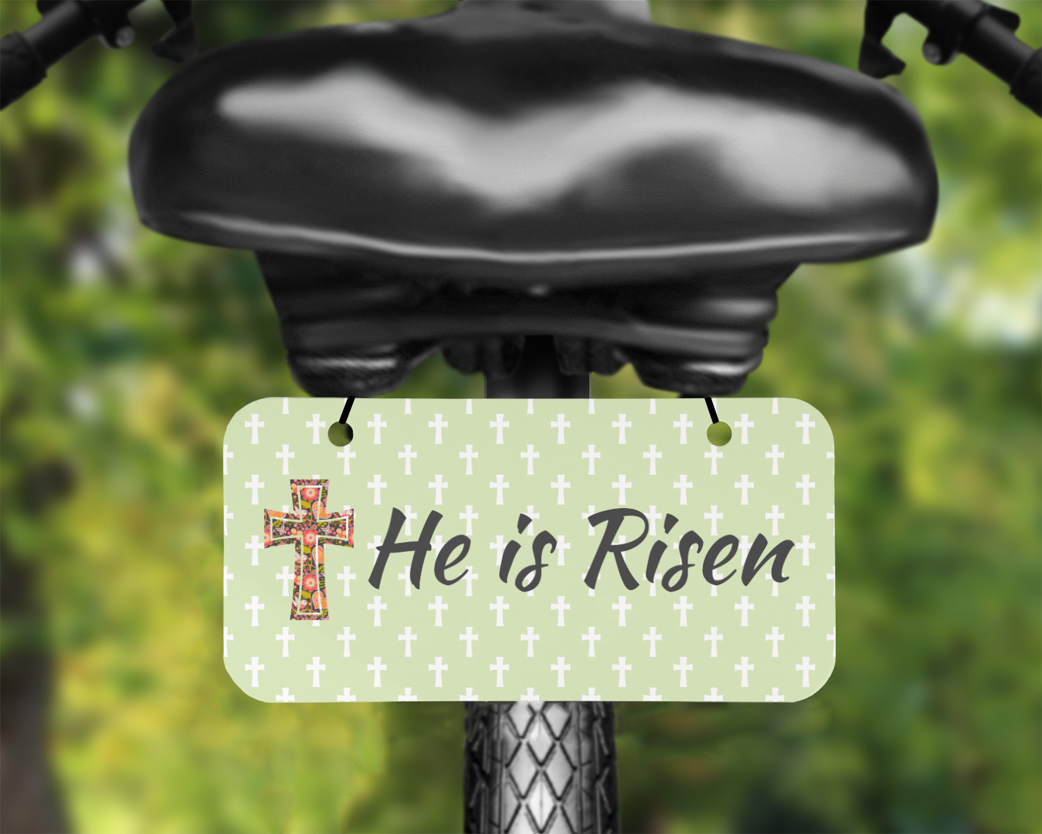 This Easter design celebrates the resurrection of Jesus Christ. For our background, we chose to use the vertically split background where the sides are a simple tone on tone pattern of crosses. The middle is a solid color. We chose a light green to represent spring. We chose our arched text and graphic style for the foreground. For the graphic, we chose a simple cross that is filled with floral pattern of birds and hearts. For our text we used "He is Risen" on top and "Happy Easter" on the bottom.