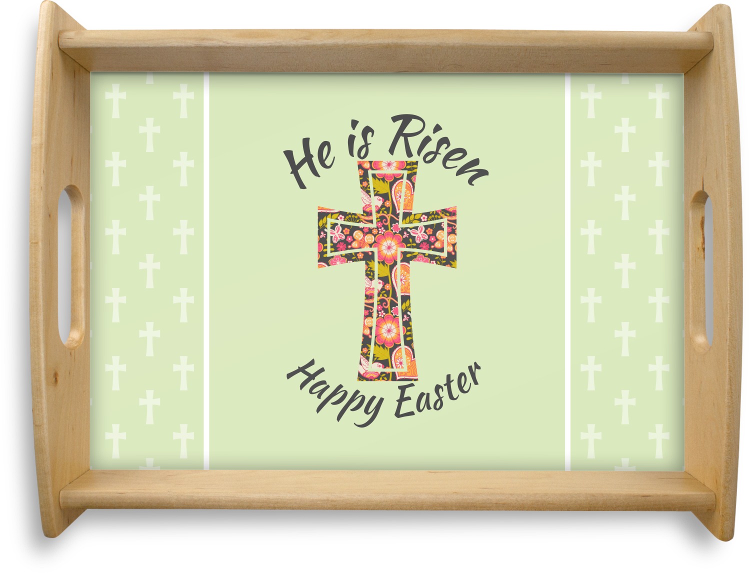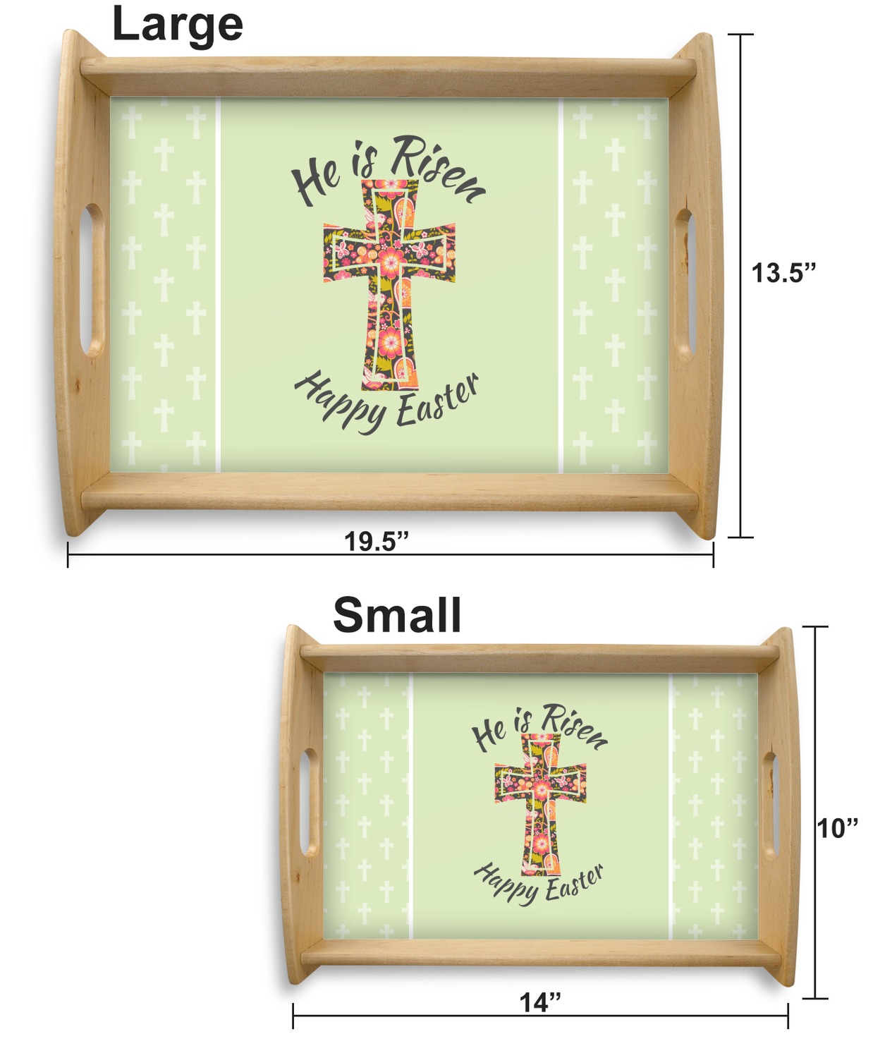 This serving tray with handles features square edges and two rounded sides, creating a very modern look. Each side is fabricated from a beautifully cut, natural wood. The bottom of the interior of the tray displays your customized design in bright, vibrant color. The tray is sold in both a black color and a natural wood look. Each variation of the wood serving tray has two sizes: Small, which is 14" x 10" x 2.25", and Large, which is 19.5" x 13.5" x 2.75".