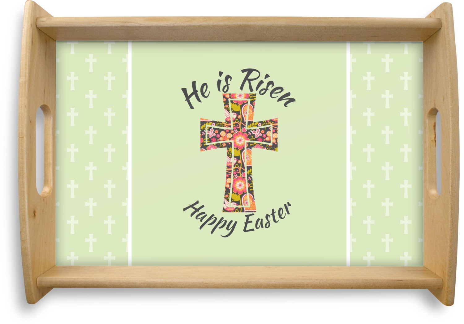 This serving tray with handles features square edges and two rounded sides, creating a very modern look. Each side is fabricated from a beautifully cut, natural wood. The bottom of the interior of the tray displays your customized design in bright, vibrant color. The tray is sold in both a black color and a natural wood look. Each variation of the wood serving tray has two sizes: Small, which is 14" x 10" x 2.25", and Large, which is 19.5" x 13.5" x 2.75".