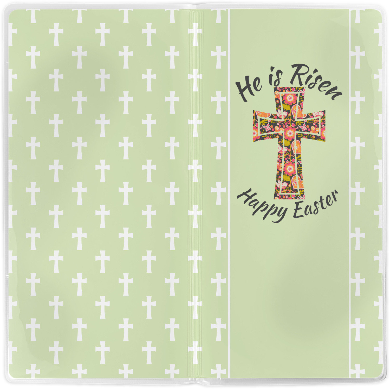 This Easter design celebrates the resurrection of Jesus Christ. For our background, we chose to use the vertically split background where the sides are a simple tone on tone pattern of crosses. The middle is a solid color. We chose a light green to represent spring. We chose our arched text and graphic style for the foreground. For the graphic, we chose a simple cross that is filled with floral pattern of birds and hearts. For our text we used "He is Risen" on top and "Happy Easter" on the bottom.