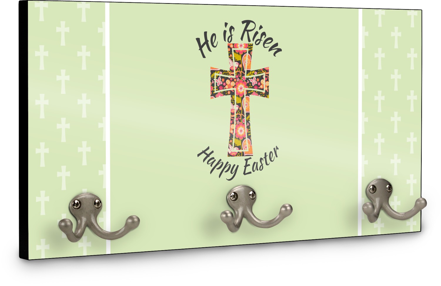 This coat rack is the perfect way to add some personality to your wall or entryway. The board is made of a strong maple that is approximately 16" x 8". The three 2-prong hooks are a sturdy metal that have three screws attaching them to the board. Your design is printed right onto the front of the board while the back and sides are a simple black.
