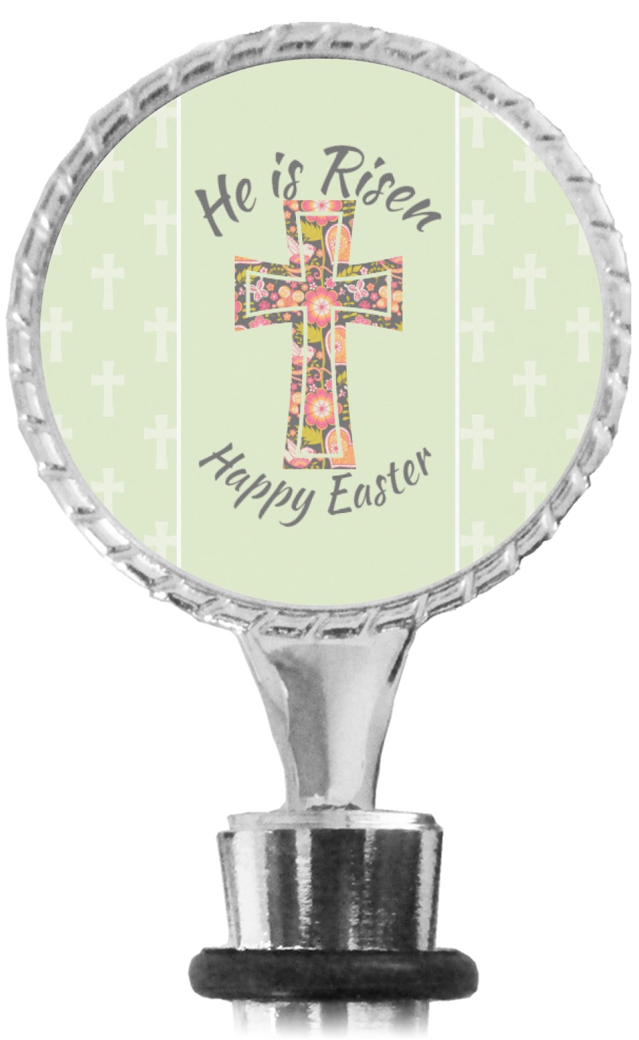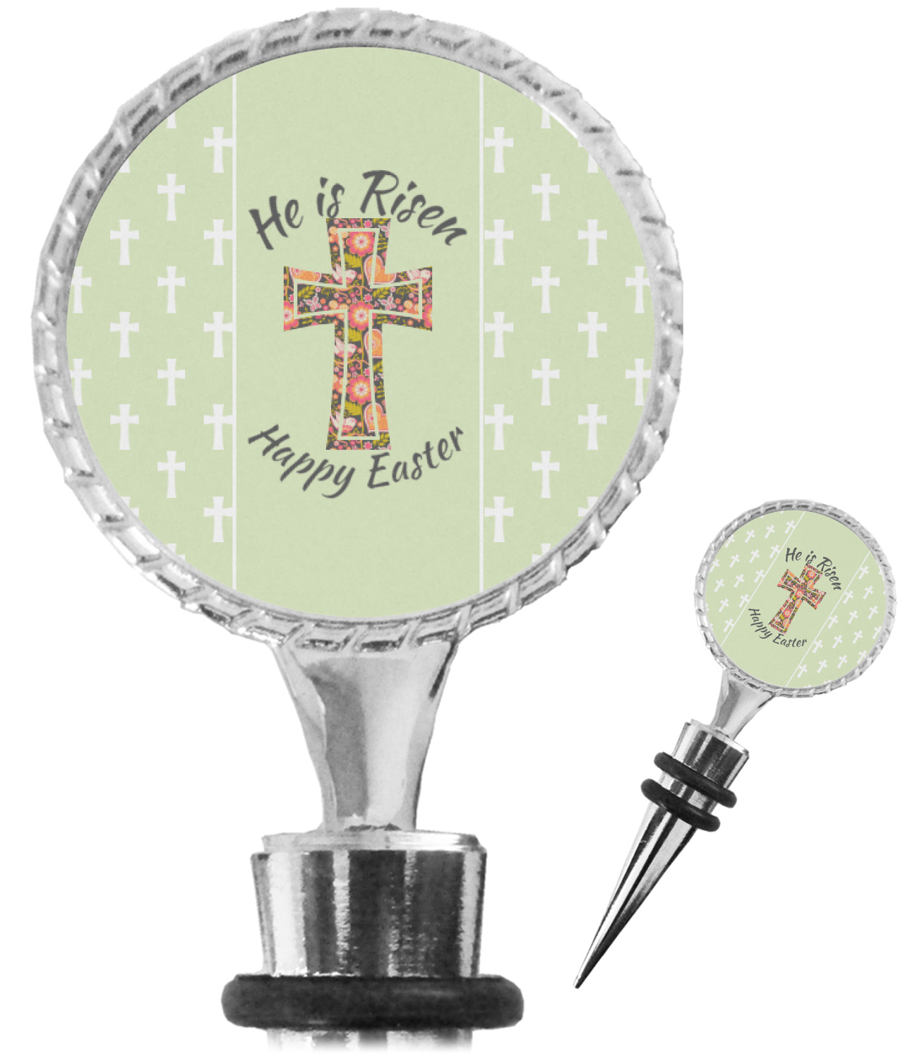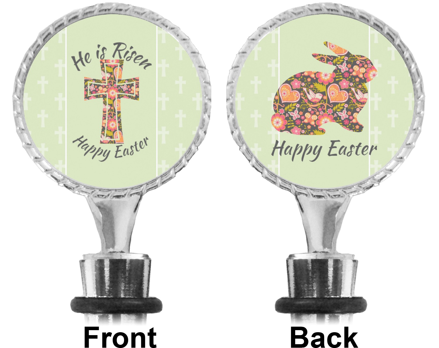 The top part of your bottle stopper is comprised of a zinc ring that displays your customization(s) in its middle, on both sides. The ring is heavy duty, with a bright chrome finish. The body of the wine stoppers have two silicone rings to provide an airtight seal. These wine bottle stoppers measure at 1.625" L x 0.8125" W x 4.625" H; your custom wine stopper is meant to fit into most standard-sized wine bottles.