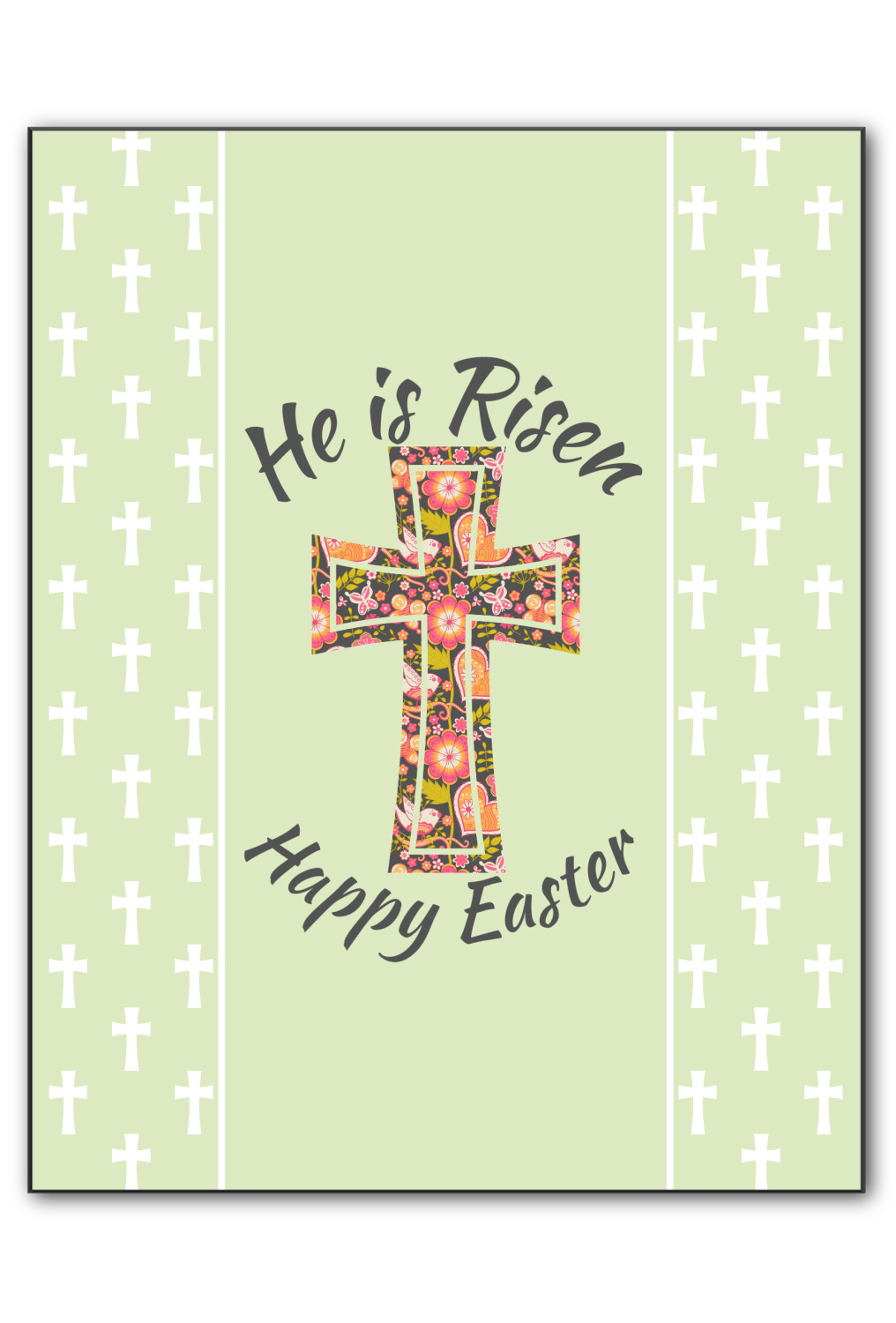 This Easter design celebrates the resurrection of Jesus Christ. For our background, we chose to use the vertically split background where the sides are a simple tone on tone pattern of crosses. The middle is a solid color. We chose a light green to represent spring. We chose our arched text and graphic style for the foreground. For the graphic, we chose a simple cross that is filled with floral pattern of birds and hearts. For our text we used "He is Risen" on top and "Happy Easter" on the bottom.