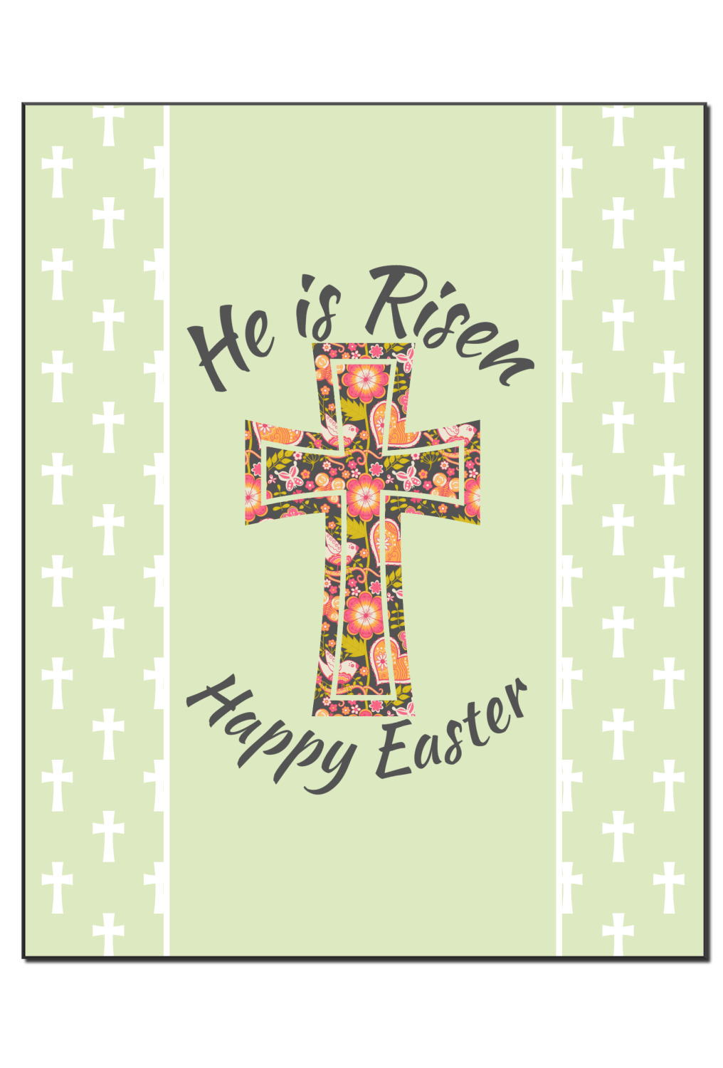 This Easter design celebrates the resurrection of Jesus Christ. For our background, we chose to use the vertically split background where the sides are a simple tone on tone pattern of crosses. The middle is a solid color. We chose a light green to represent spring. We chose our arched text and graphic style for the foreground. For the graphic, we chose a simple cross that is filled with floral pattern of birds and hearts. For our text we used "He is Risen" on top and "Happy Easter" on the bottom.