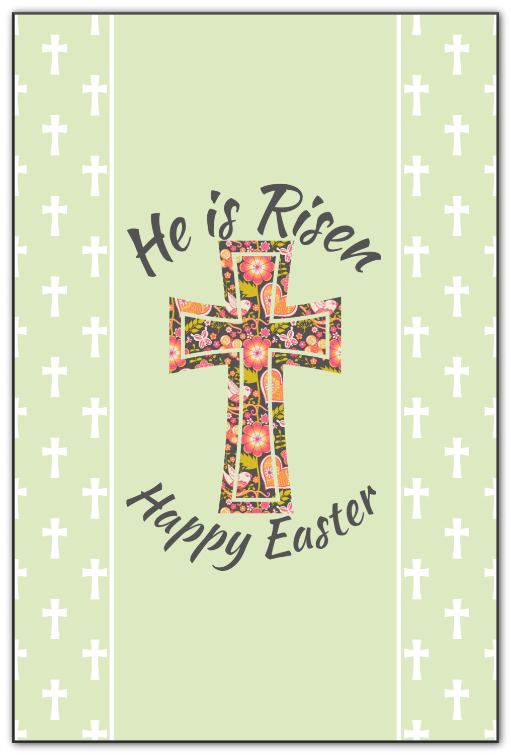 This Easter design celebrates the resurrection of Jesus Christ. For our background, we chose to use the vertically split background where the sides are a simple tone on tone pattern of crosses. The middle is a solid color. We chose a light green to represent spring. We chose our arched text and graphic style for the foreground. For the graphic, we chose a simple cross that is filled with floral pattern of birds and hearts. For our text we used "He is Risen" on top and "Happy Easter" on the bottom.