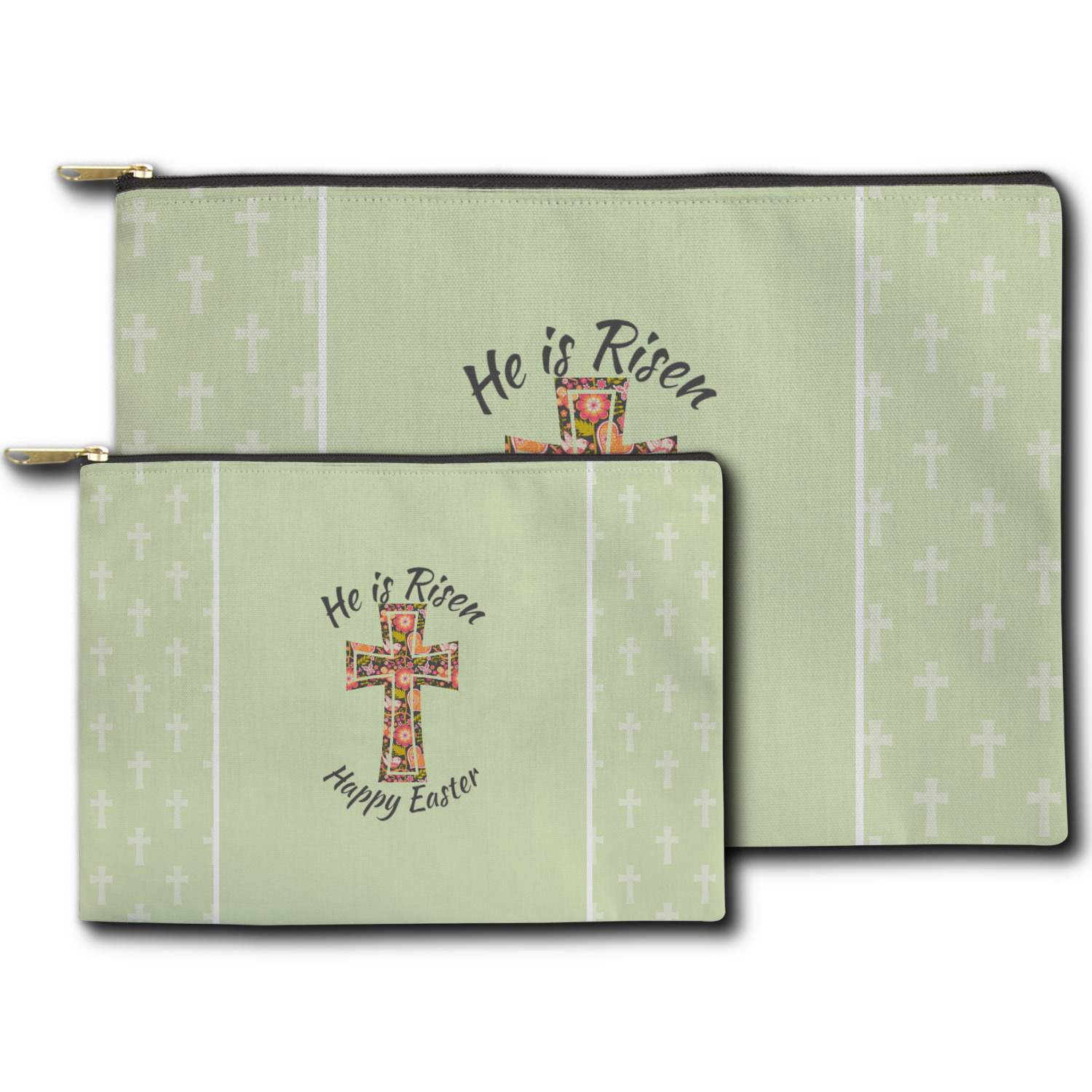 Our zippered pouches are available in two sizes - small: approx 8.5W"x6H and large: approx 12.5Wx8.5H. The pouches are made from a soft & durable canvas fabric that is printed on the outside with your design; the inside has a fused black lining. The printed canvas fabric is then cut and the pouches are sewn right here in the USA. The zipper itself is gold in color and has a round hook.