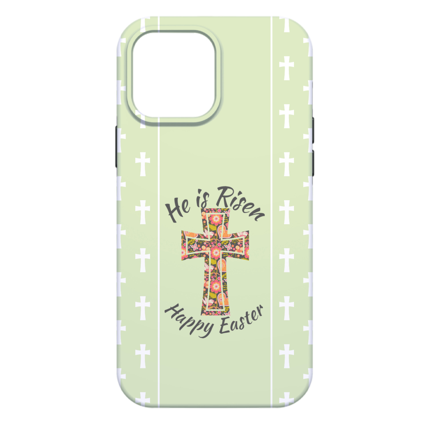 This Easter design celebrates the resurrection of Jesus Christ. For our background, we chose to use the vertically split background where the sides are a simple tone on tone pattern of crosses. The middle is a solid color. We chose a light green to represent spring. We chose our arched text and graphic style for the foreground. For the graphic, we chose a simple cross that is filled with floral pattern of birds and hearts. For our text we used "He is Risen" on top and "Happy Easter" on the bottom.