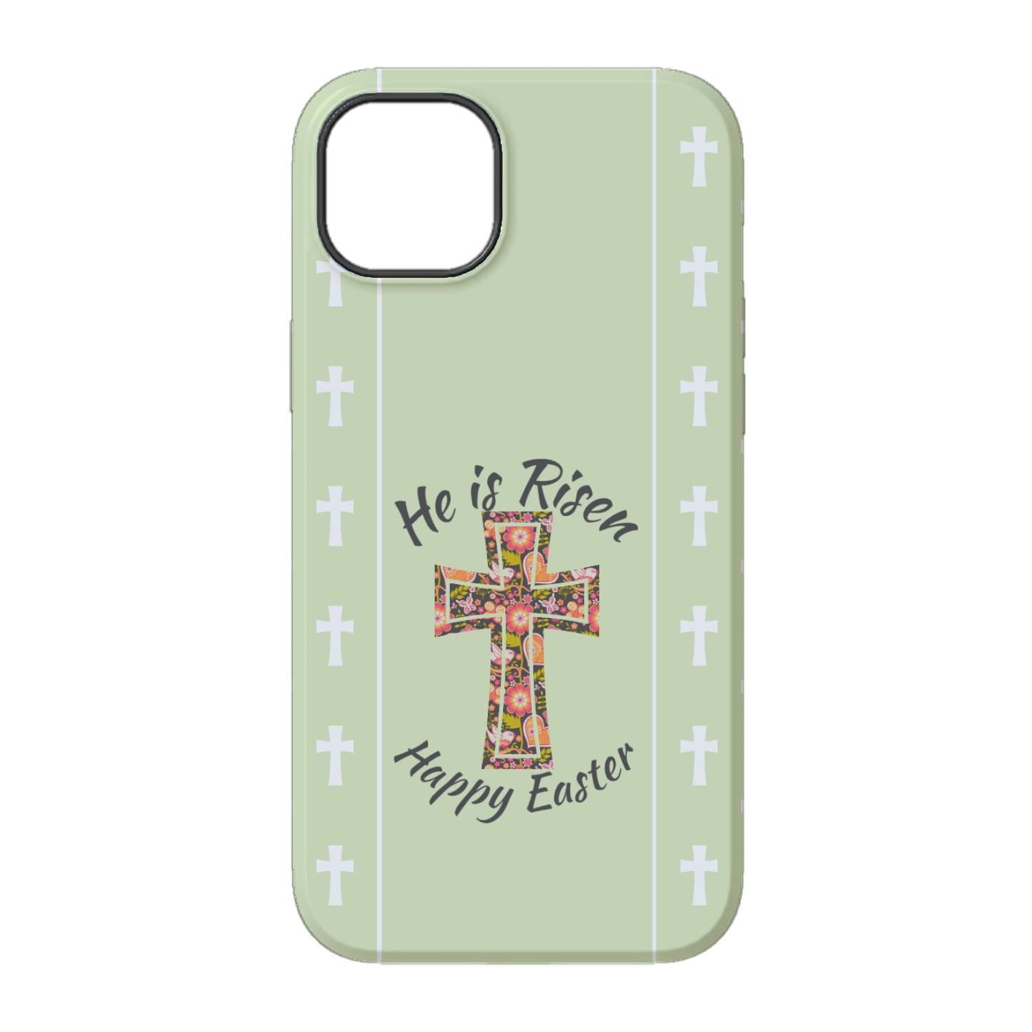 This Easter design celebrates the resurrection of Jesus Christ. For our background, we chose to use the vertically split background where the sides are a simple tone on tone pattern of crosses. The middle is a solid color. We chose a light green to represent spring. We chose our arched text and graphic style for the foreground. For the graphic, we chose a simple cross that is filled with floral pattern of birds and hearts. For our text we used "He is Risen" on top and "Happy Easter" on the bottom.