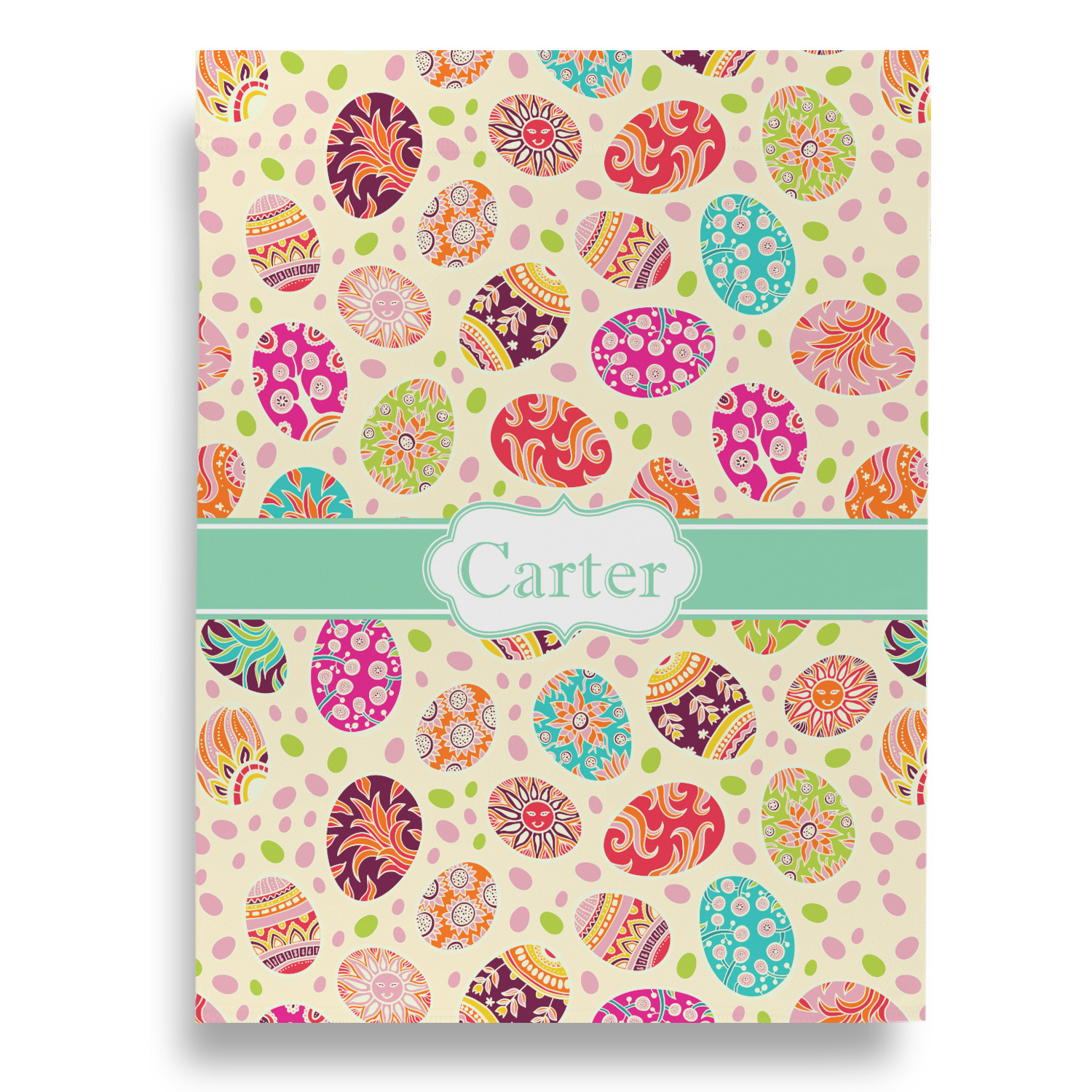 Celebrate Easter with this graphic and whimsical design! Featured in the design are multicolored, patterned Easter eggs and pink and green jelly beans on a cream background.