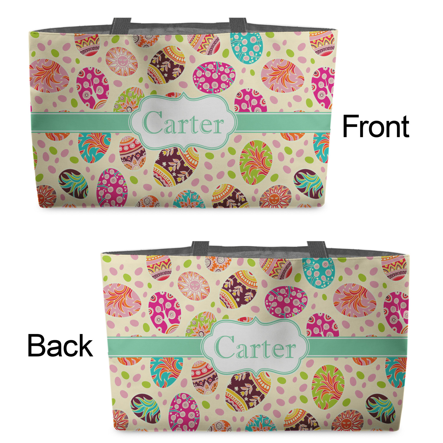 These beach totes are handmade here in the USA. Fabric is printed with your design. The tote is then sewn from the fabric pieces, lining and handles added.