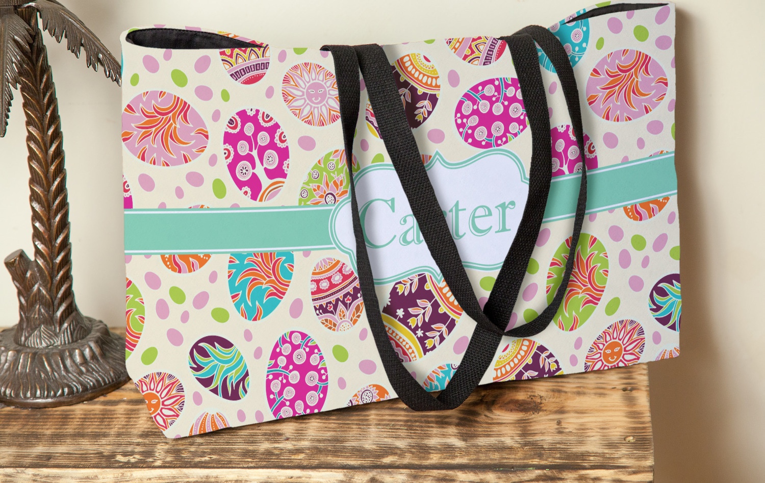 The totes are made from a sturdy canvas material on the outside and are lined with a black poly cotton lining. The beach totes have an approx. 28" black woven handles.