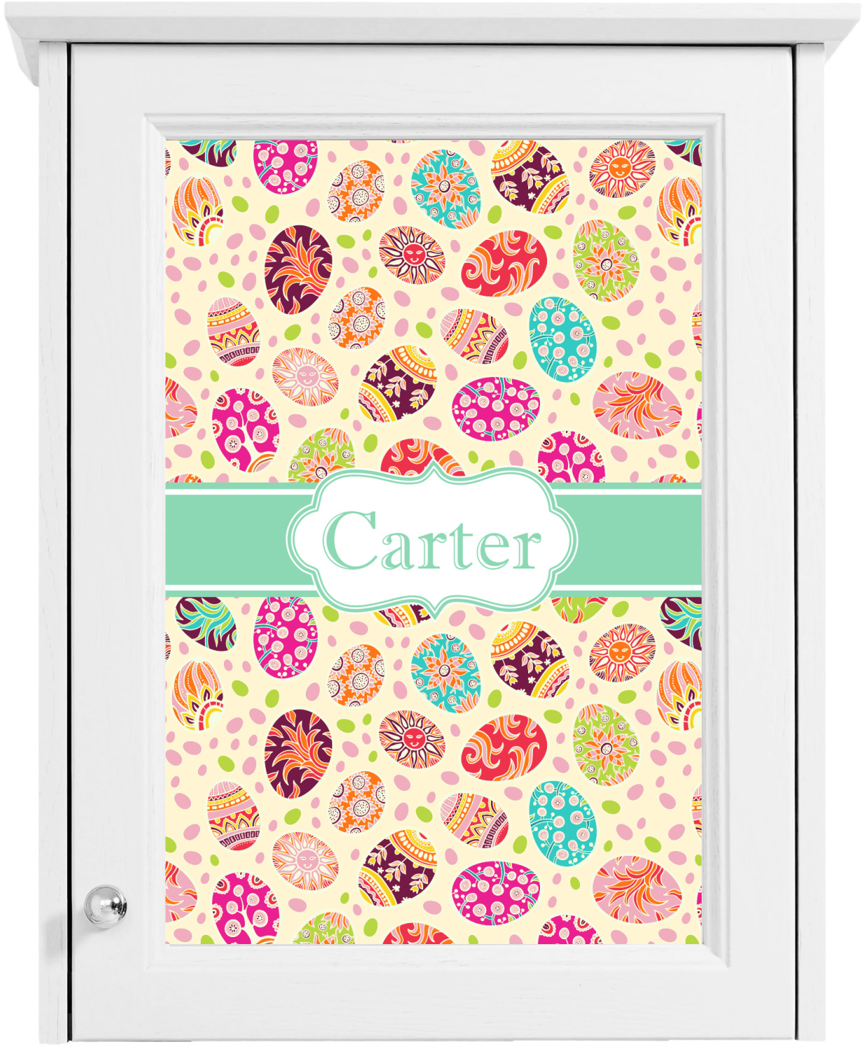 Celebrate Easter with this graphic and whimsical design! Featured in the design are multicolored, patterned Easter eggs and pink and green jelly beans on a cream background.