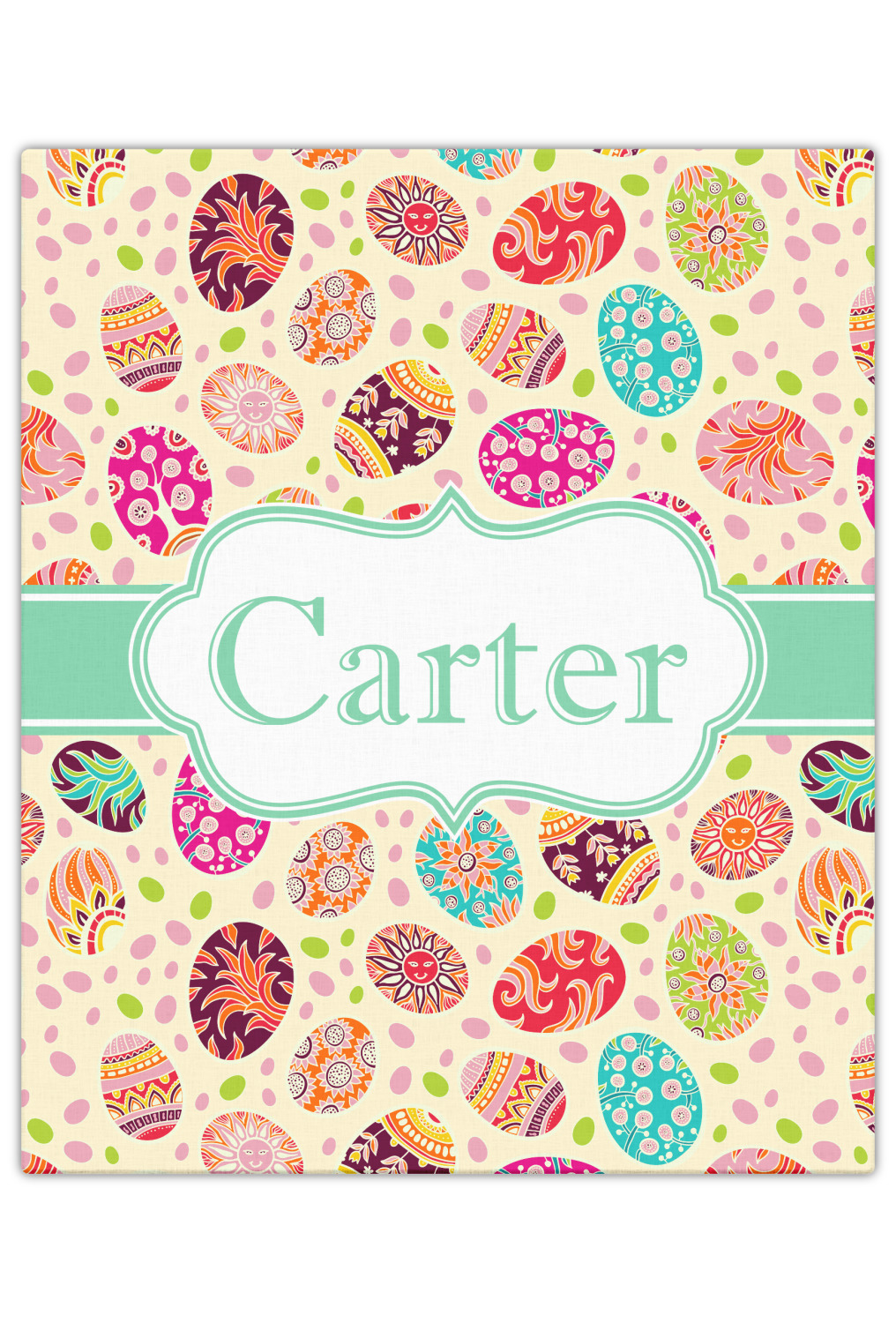 Celebrate Easter with this graphic and whimsical design! Featured in the design are multicolored, patterned Easter eggs and pink and green jelly beans on a cream background.