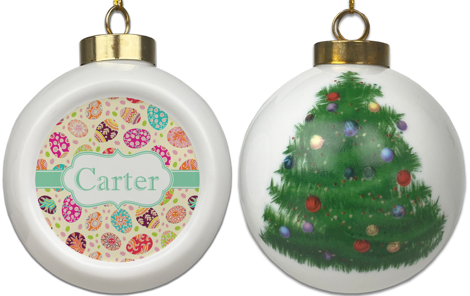 Our Christmas ornaments are a unique ceramic ball shape with a twist as it has a flat face to display your custom design! Select from one of our two design types - Christmas Tree or Poinsettia Garland - to adorn the curved back of your personal design. Each ornament measures 3H x 2.5W x 2D accompanied with a gold string accent for finishing touches to hang on your beautiful Christmas tree!