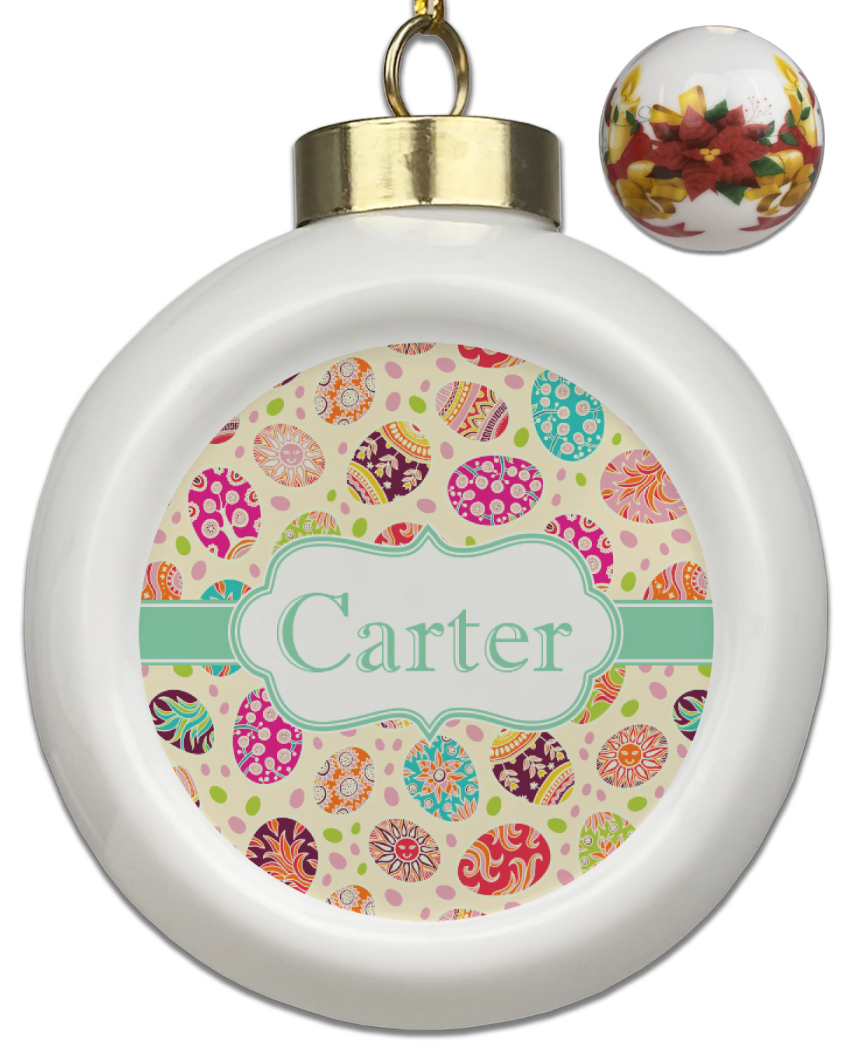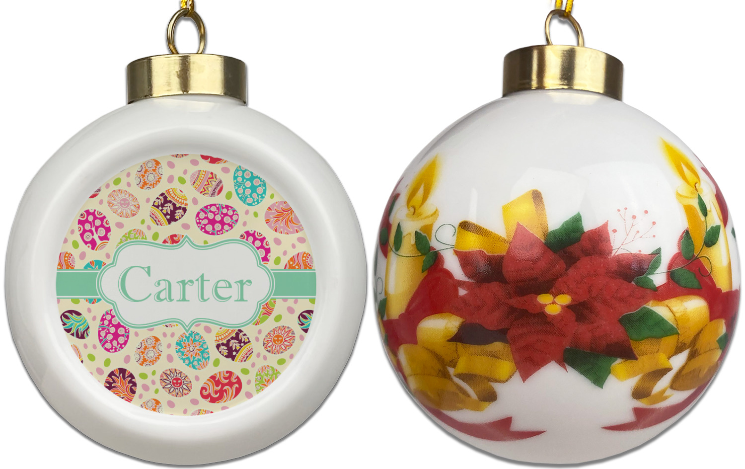 Our Christmas ornaments are a unique ceramic ball shape with a twist as it has a flat face to display your custom design! Select from one of our two design types - Christmas Tree or Poinsettia Garland - to adorn the curved back of your personal design. Each ornament measures 3H x 2.5W x 2D accompanied with a gold string accent for finishing touches to hang on your beautiful Christmas tree!