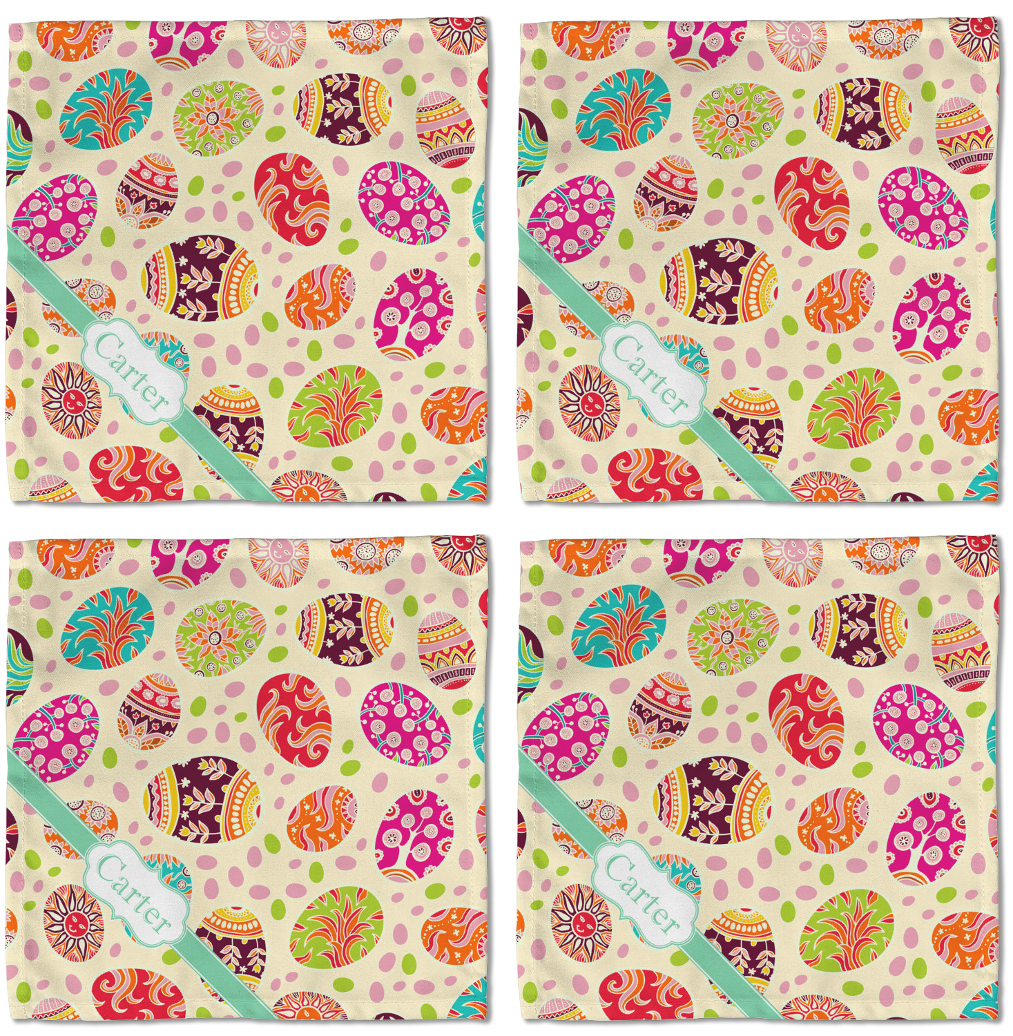 Celebrate Easter with this graphic and whimsical design! Featured in the design are multicolored, patterned Easter eggs and pink and green jelly beans on a cream background.