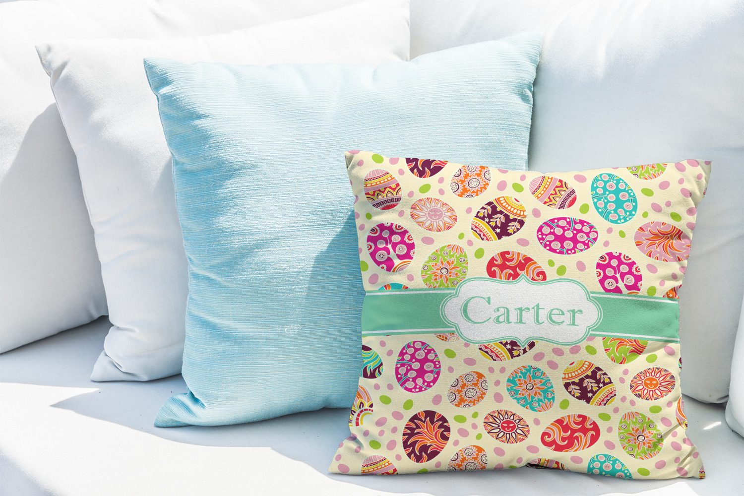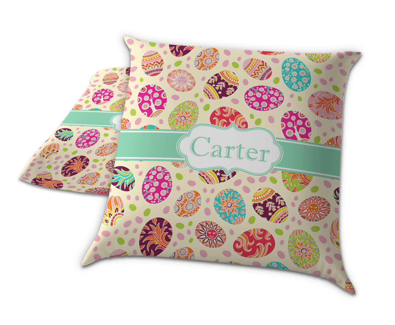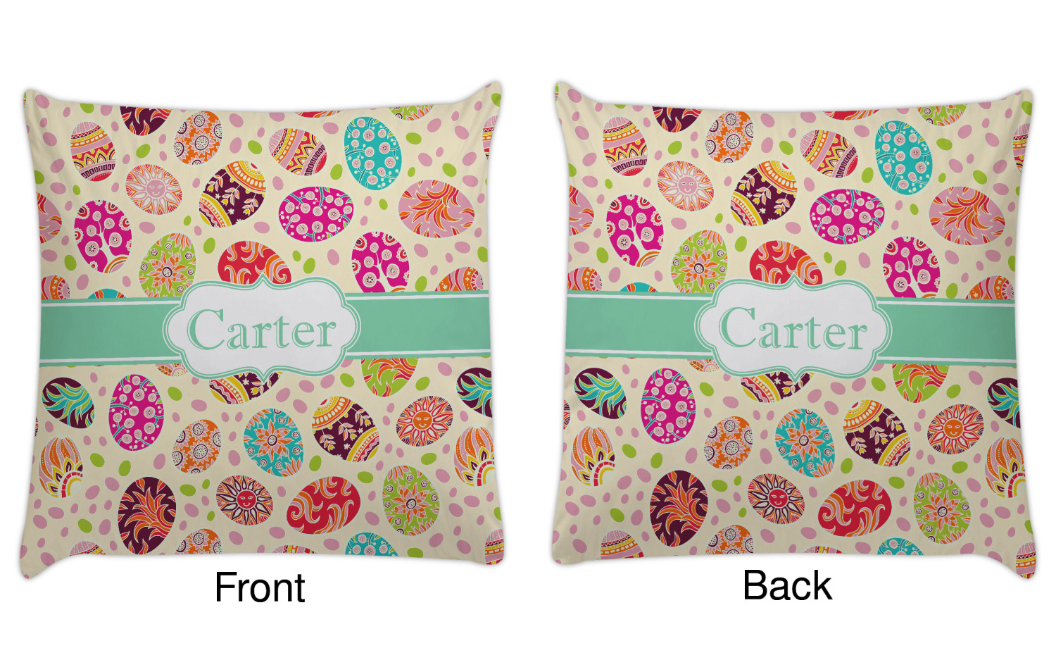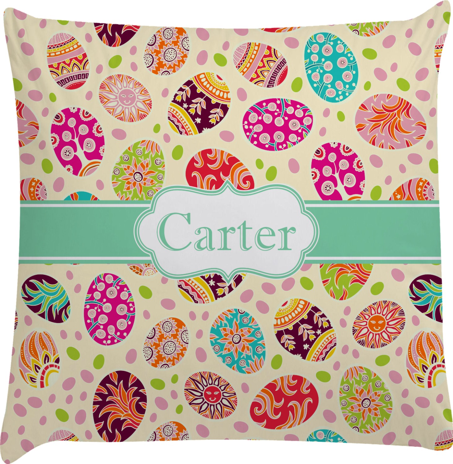 Celebrate Easter with this graphic and whimsical design! Featured in the design are multicolored, patterned Easter eggs and pink and green jelly beans on a cream background.