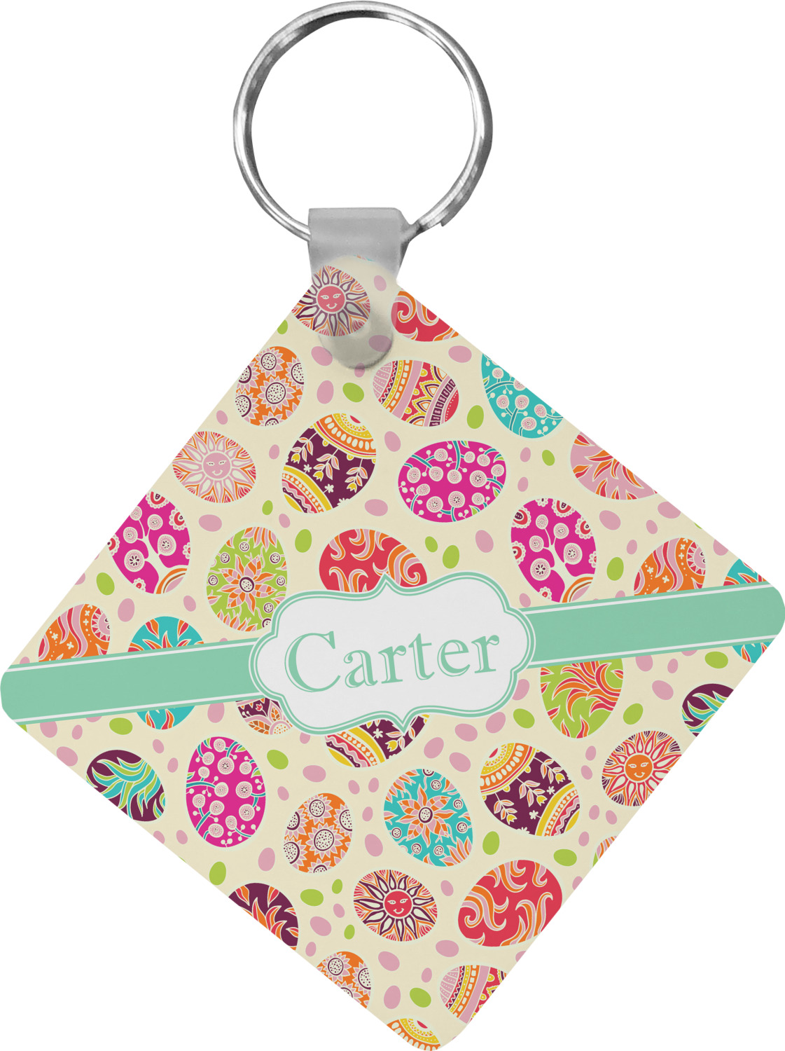 Our personalized keychains attach to the included metal, split key ring with a plastic, removable snap. Since a metal ring is included with your purchase, you have the liberty to keep your keys together on the ring, with or without your unique keychain. We offer this keychain in three different shapes: circle, heart, or diamond. We print your personalized design(s) on both sides of the key chain, and the surface has a glossy, reflective finish that only emphasizes your design. Each keychain is approximately 2.25 by 2.25 inches.