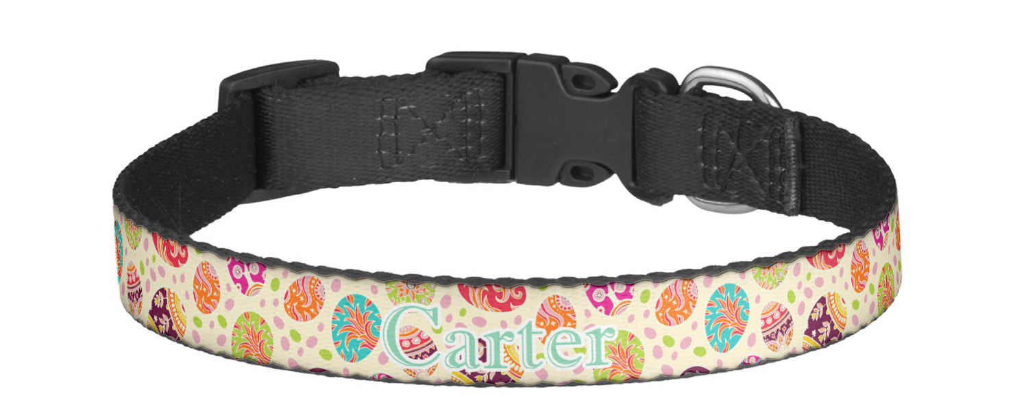 This sturdy collar, made from a durable nylon weave, will outlive your dog's episodes of excited tugging and pulling. Courtesy of its thick plastic buckle and adjuster, this collar is adjustable and accommodating of any dog. Structurally, the collar is a single piece of nylon weave that is sewn together, and features a solid metal loop where you can attach a leash or dog tag. We print and display your dog's name and pattern across the middle of the personalized dog collar.