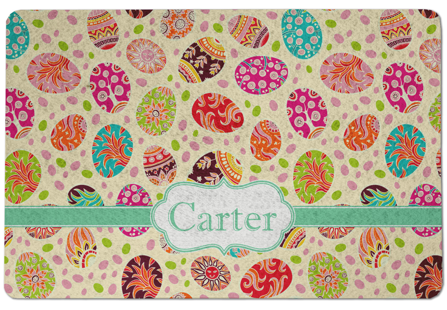 Celebrate Easter with this graphic and whimsical design! Featured in the design are multicolored, patterned Easter eggs and pink and green jelly beans on a cream background.