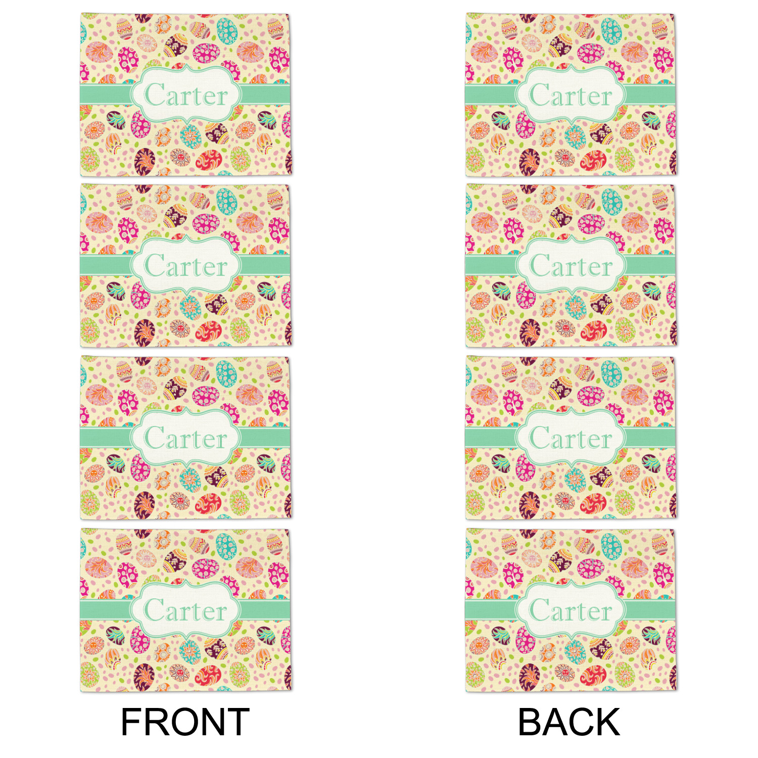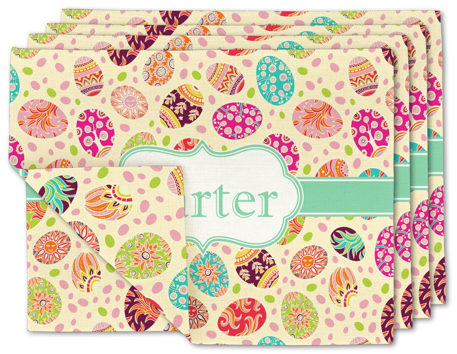 Celebrate Easter with this graphic and whimsical design! Featured in the design are multicolored, patterned Easter eggs and pink and green jelly beans on a cream background.