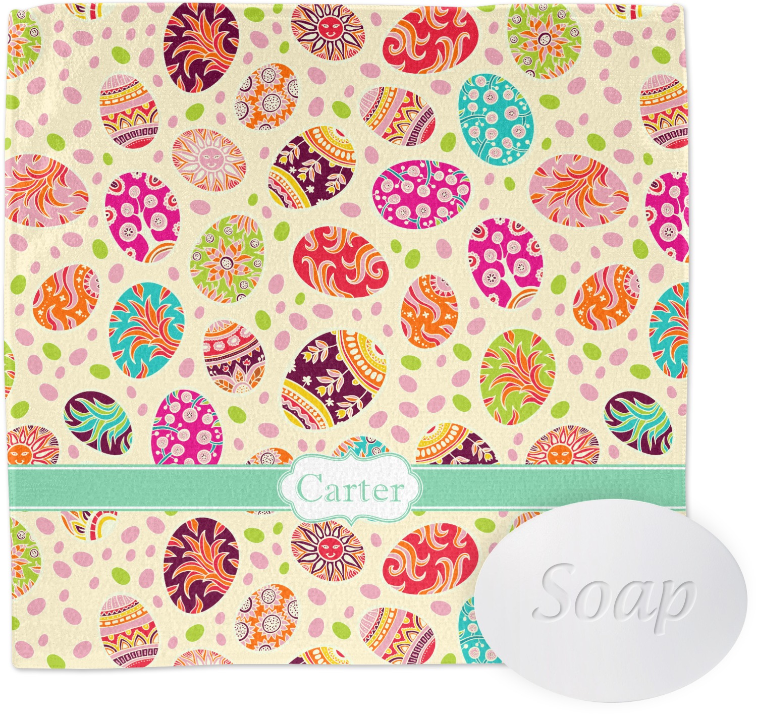 Celebrate Easter with this graphic and whimsical design! Featured in the design are multicolored, patterned Easter eggs and pink and green jelly beans on a cream background.
