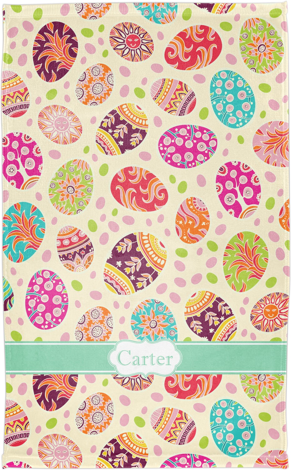 Celebrate Easter with this graphic and whimsical design! Featured in the design are multicolored, patterned Easter eggs and pink and green jelly beans on a cream background.