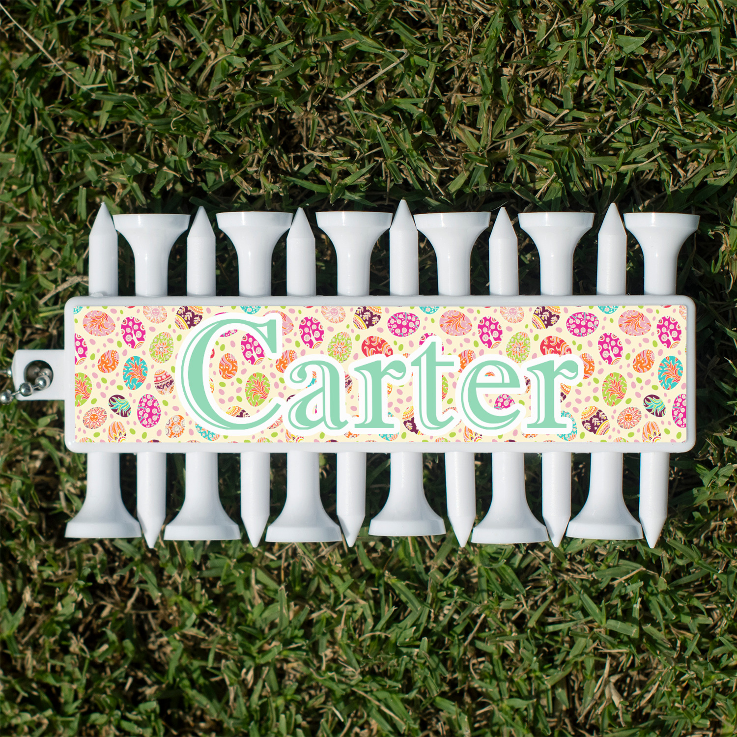 With 12 tees on a lightweight, portable key chain, it almost ensures a great 18 holes. Our tees are made of white plastic and are a little over 2". Design the front and the back of the golf tee holder. Pick from over a hundred designs, colors, and personalization styles! The set even comes with three removable ball markers as well!