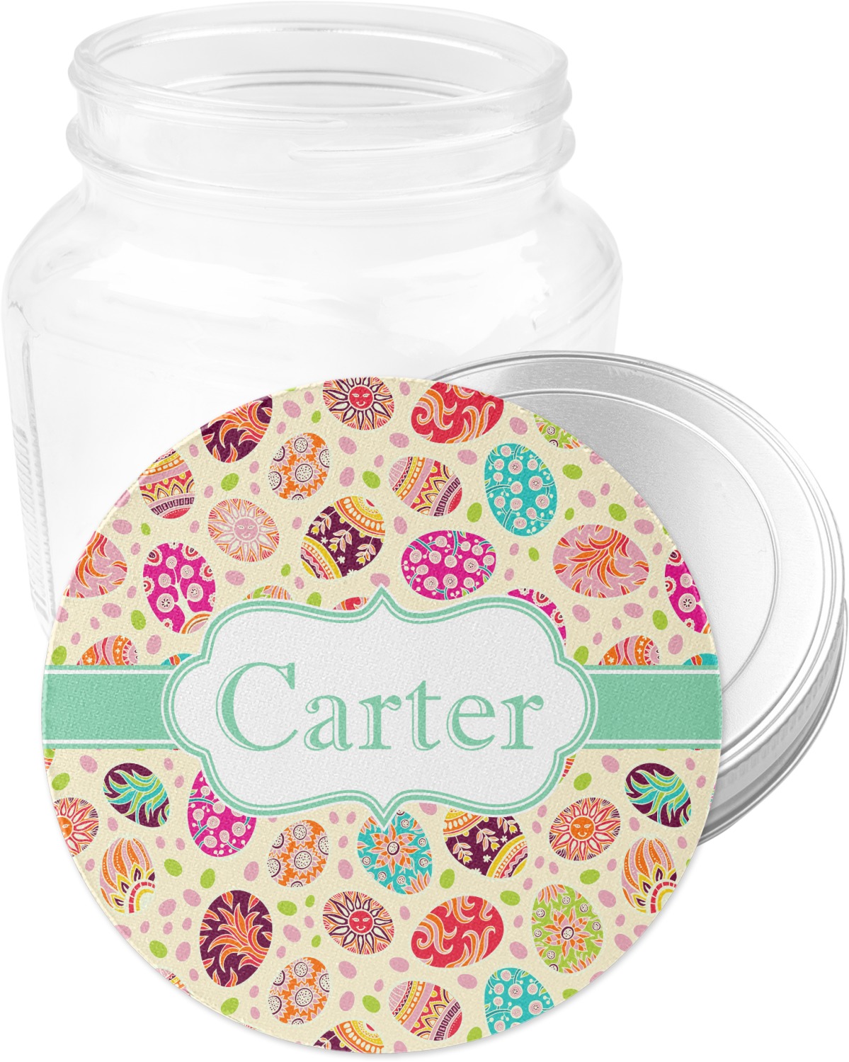 Celebrate Easter with this graphic and whimsical design! Featured in the design are multicolored, patterned Easter eggs and pink and green jelly beans on a cream background.