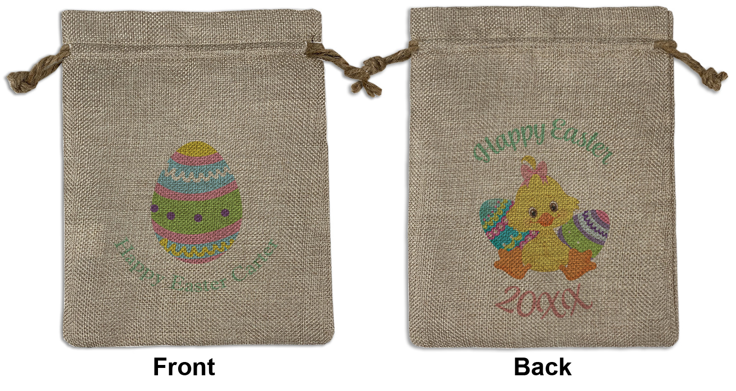 We sell our Burlap Gift Bags in 3 variant sized bags. Made with burlap polyester, each personalized bag can be secured with a twine drawstring pull. Your custom design is available to print on one side or both sides - completely up to you! The sizes of the bags measure approximately 4.5" x 6.5" for the smallest size, 6.5" x 8.0" for the medium size, and 6.5" x 13.5" for the large-sized bag.