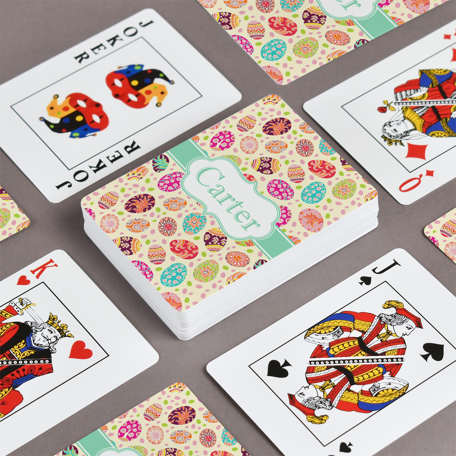 The customization / personalization is printed on the back side. The playing cards have a low gloss coating on both sides. The cards are packaged in a clear plastic box.